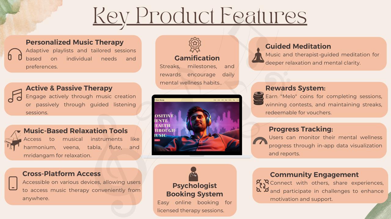 MeloChemy offers AI-driven personalized music therapy, tailored playlists, guided meditation, and therapist integration to help users manage mental health challenges. It combines scientifically proven therapy techniques, gamification, and real-time emotional tracking to enhance emotional well-being in a fun and effective way.