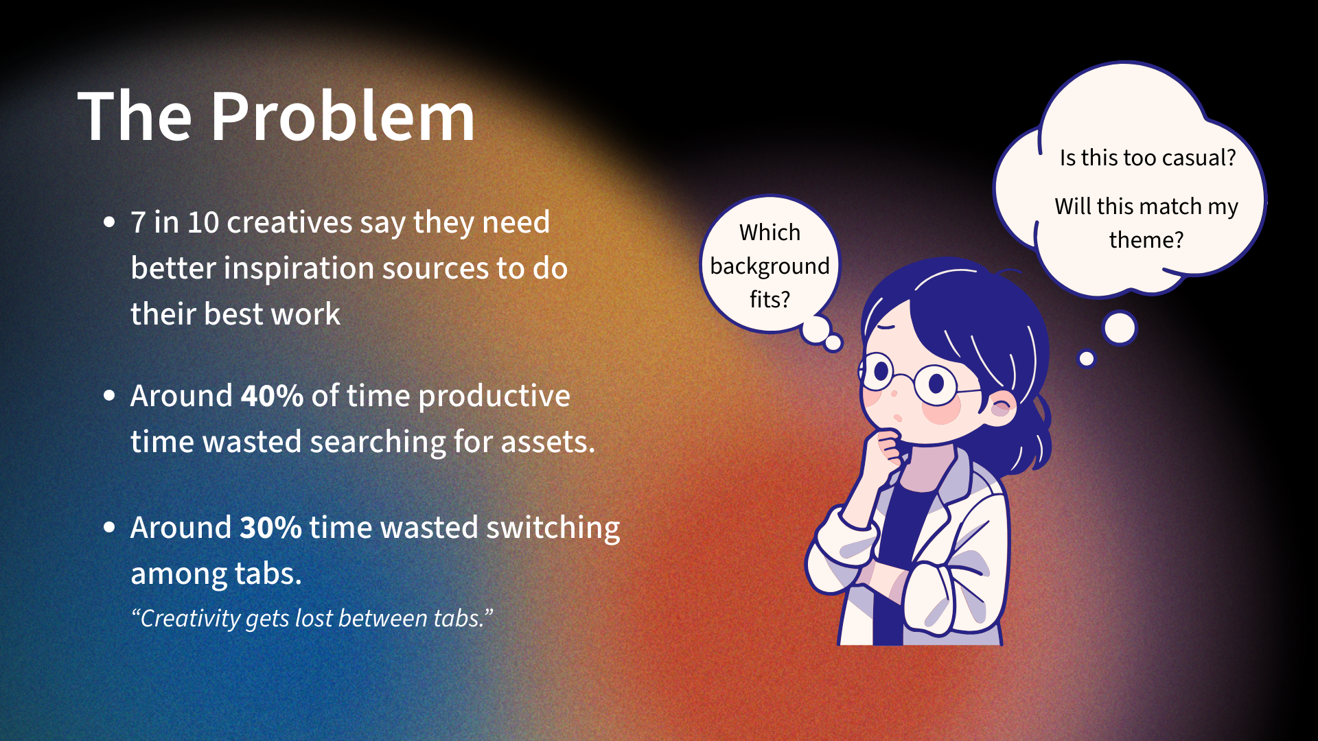 - Designers waste time switching between tools to find assets