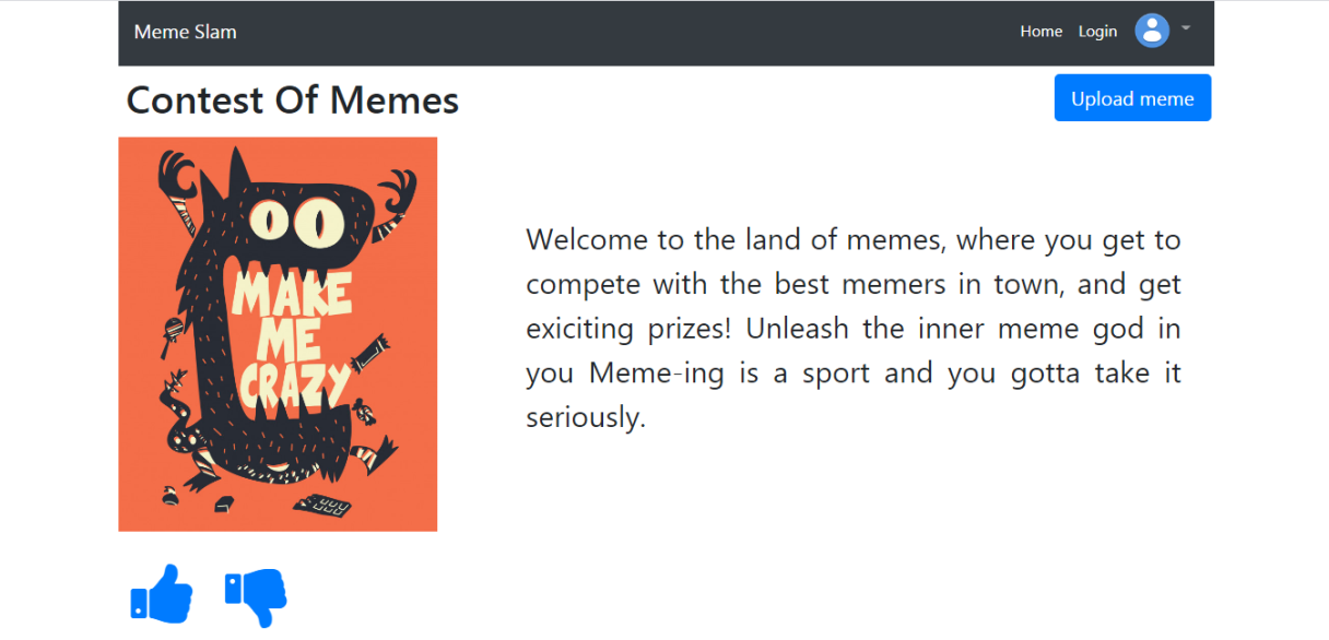 We have made a website where you can organise MemeSlams, by filling out the details. The users can register for the contests,and upload their submissions. Every Meme-Slam will adhere to some theme, and therefore it is expected that the participants make memes, related to the theme. We also have a meme gallery to honour our memers.