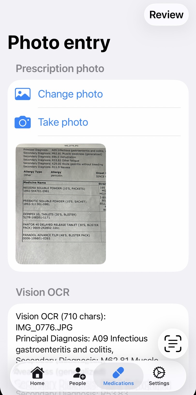 - Reads prescription photos using on-device OCR, then uses an on-device LLM to extract structured medication data