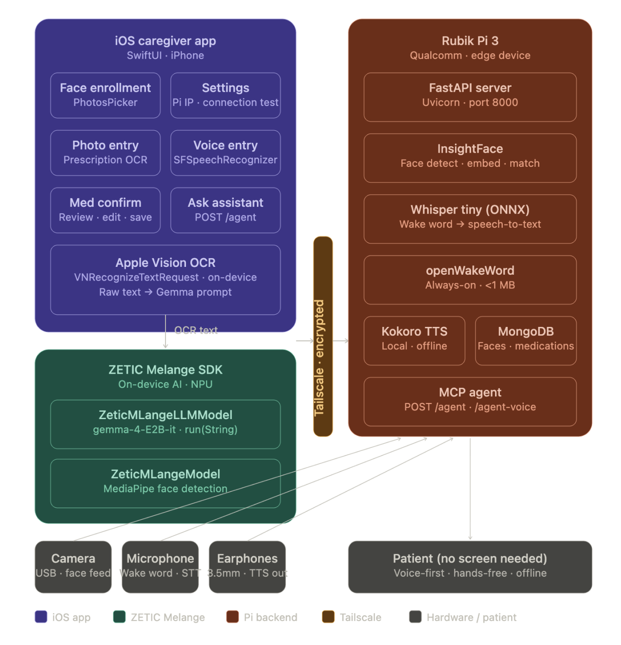 Patient Device — Rubik Pi 3 running a FastAPI server backed by MongoDB. InsightFace handles face detection and embedding. openWakeWord listens continuously for the wake word. Whisper tiny (ONNX) handles speech-to-text once triggered. An MCP agent then processes the query, calls the right tools (set reminder, get medications, add medication), and Kokoro TTS speaks the response through earphones.