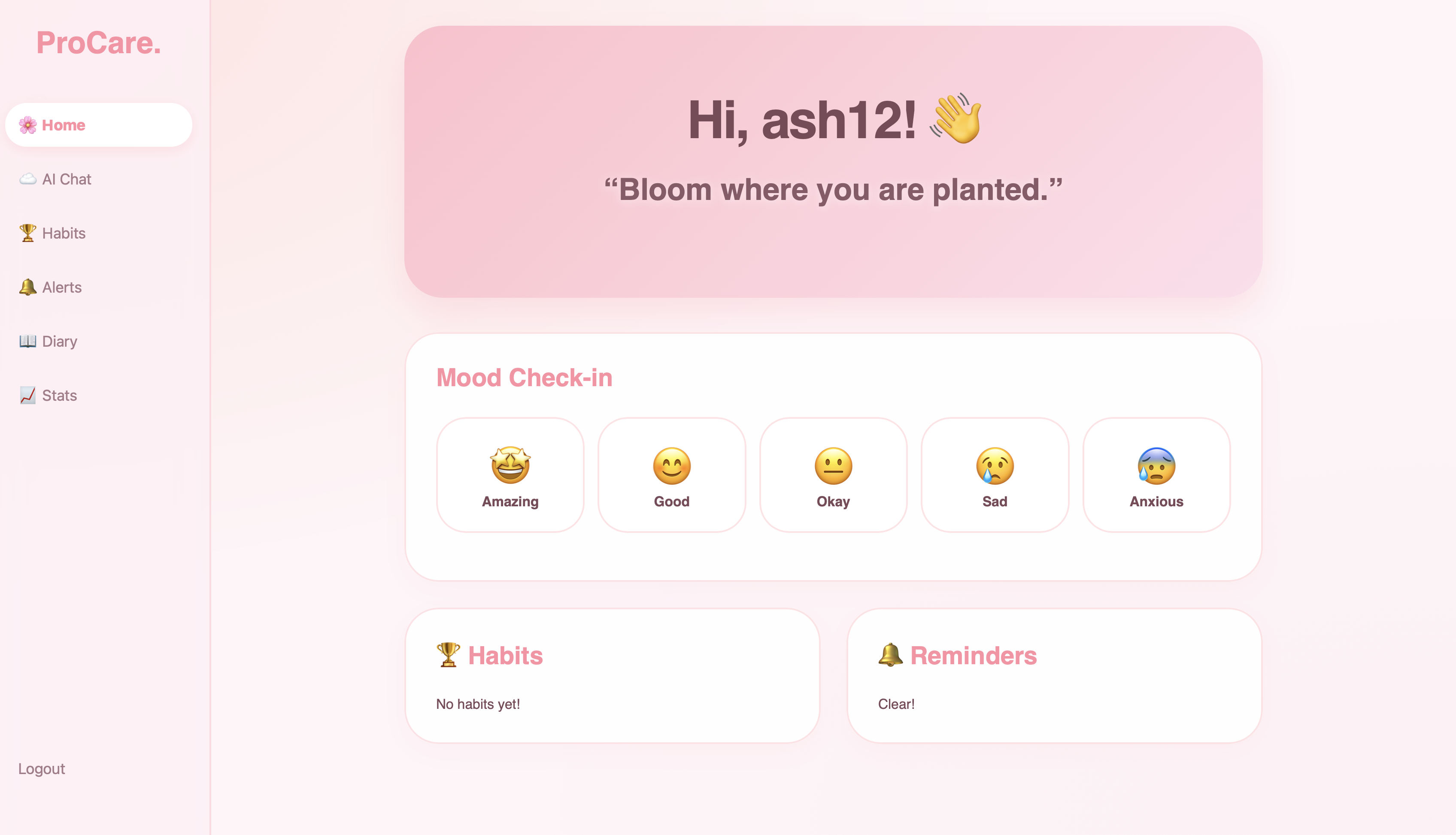We needed something like this in our daily lives. It provides a space where the user can log their moods, keep track of their habits, talk to an AI chatbot, set reminders, and write in a private journal. ProCare is build on a Full-stack javascript formwork design for Bothe speed and empathy. The frontend uses HTML5 and CSS3 with 'glass morphism' effect to create a calming, accessible user interface, while javascript hands the real time data like mood logs and habit tracking using local storage for privacy. Finding the right API key was one of the biggest challenges we had to deal with. At first we were hitting credit limits and getting "Invalid key". We went through a whole process of trial and error, switching between multiple different AI's providing API keys, until we stumbled upon Groq and Lama 3.3 key that actually worked. We both are proud of the effort we put into the whole project since this is both of our's first Hackathons and it was very fun just bring here. But speaking technically, we are proud of how the app came out and the entire set up of it, from each of the tabs to the inside work. This Hackathon helped us learn a lot about the code itself and how the different parts come together and create something. Like the backend and frontend concepts were more clear after the project. For the Mental Health App, we want to expand its reaches and make it a real app close in the future. We want to start off by sharing it with our friends and family, while WE are also using it and hopefully share it onto the Apple App Store.