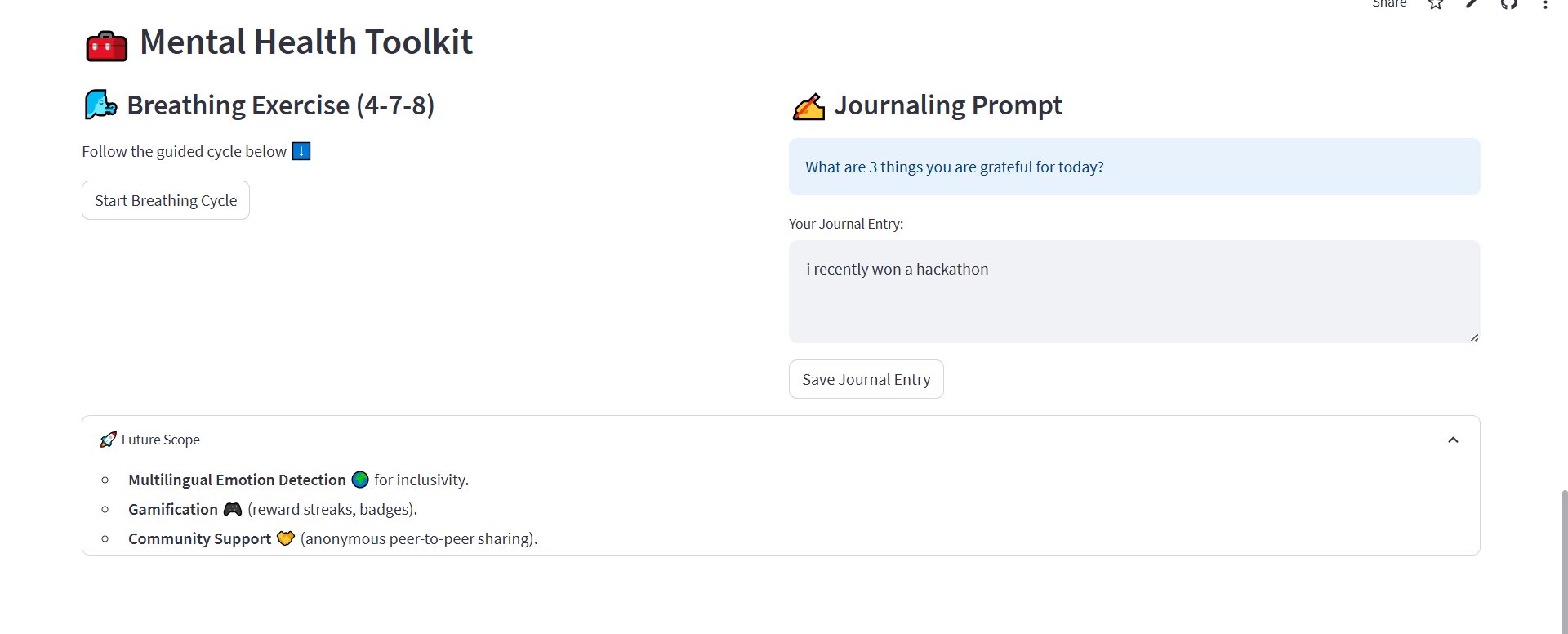 Extras: Built a mental health toolkit including guided breathing exercises and journaling prompts.