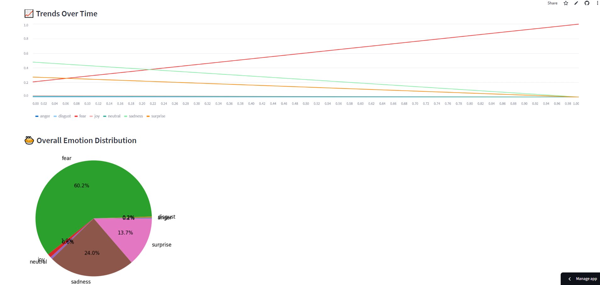 Visualizations: Matplotlib and Plotly for emotion bar graphs, trends, and overall distributions.