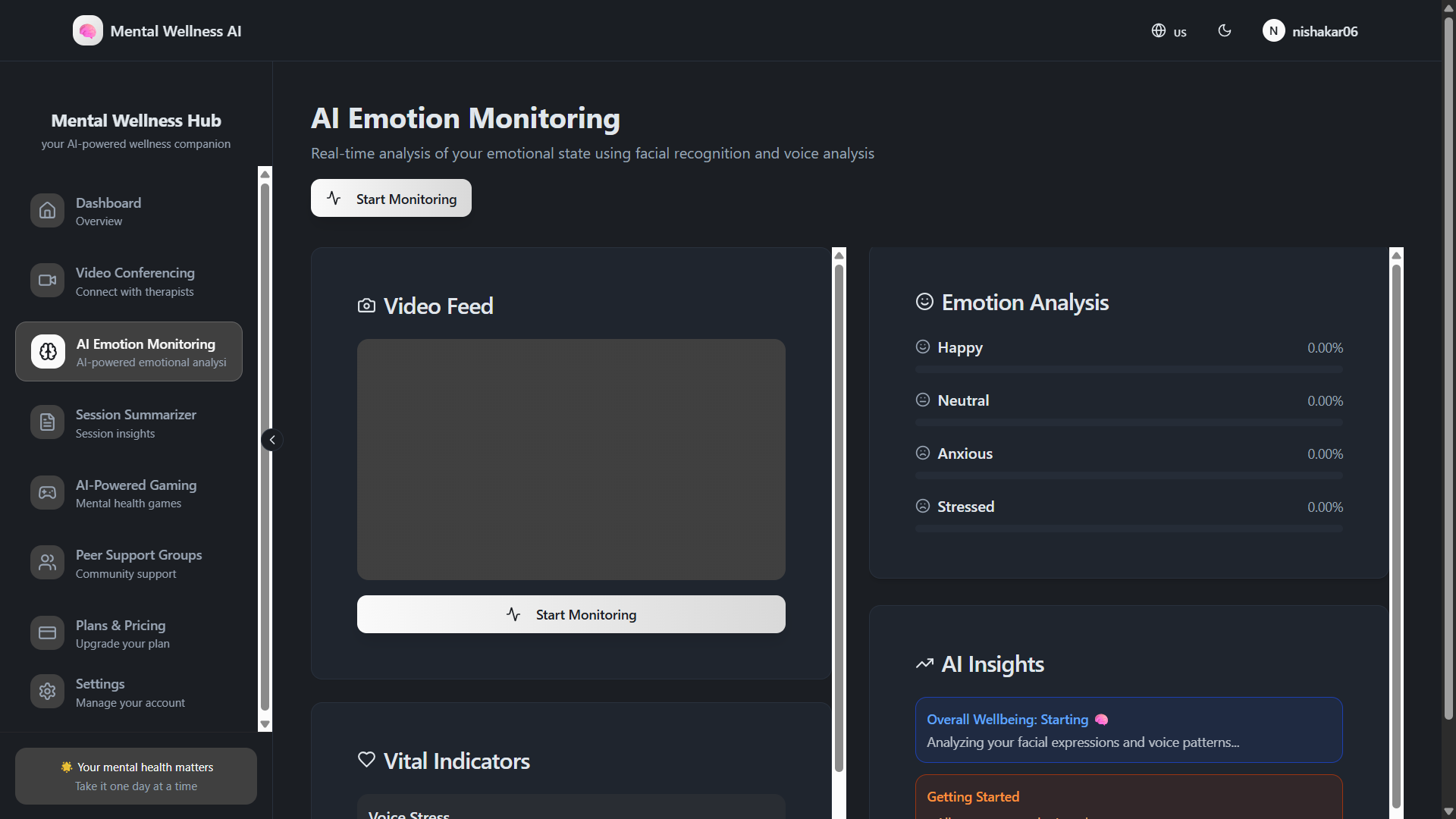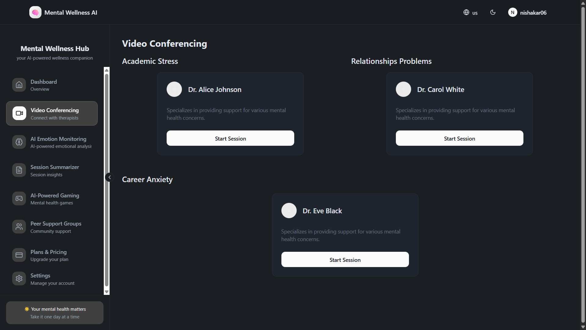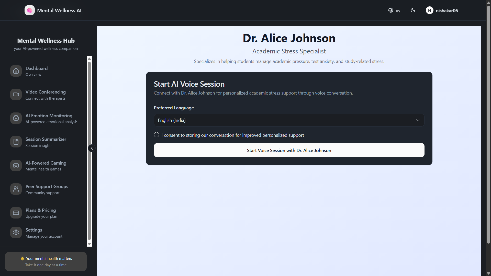 Voice-powered AI psychotherapy platform with 3 specialized psychologists: Academic Stress, Relationships, and Career Anxiety experts. Includes real-time webcam emotion monitoring, therapeutic CBT games, session summaries, English/Hindi/Tamil support, and crisis intervention protocols.