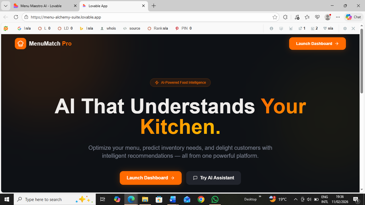 MenuMatch Pro is an AI-powered restaurant intelligence platform. It analyzes uploaded menus and inventory files, understands available stock, and provides real-time, inventory-aware recommendations. It helps restaurants optimize menus, suggest profitable combinations, track stock levels, and deliver personalized food recommendations to customers.