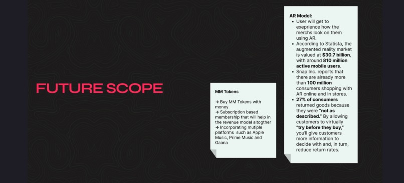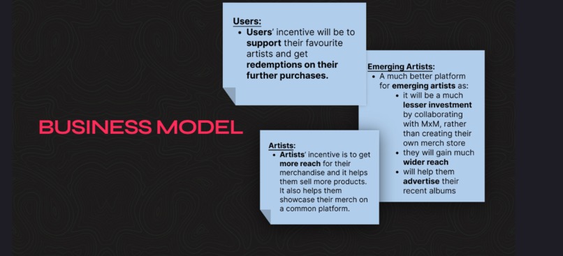 It is a web application based on Spotify's User Top Artist, they can get ** MM bucks ** and redeem and redeem discounts on further purchases of merch. It gives opportunities for up-and-coming artists their merch and increases their mass in music loving community.