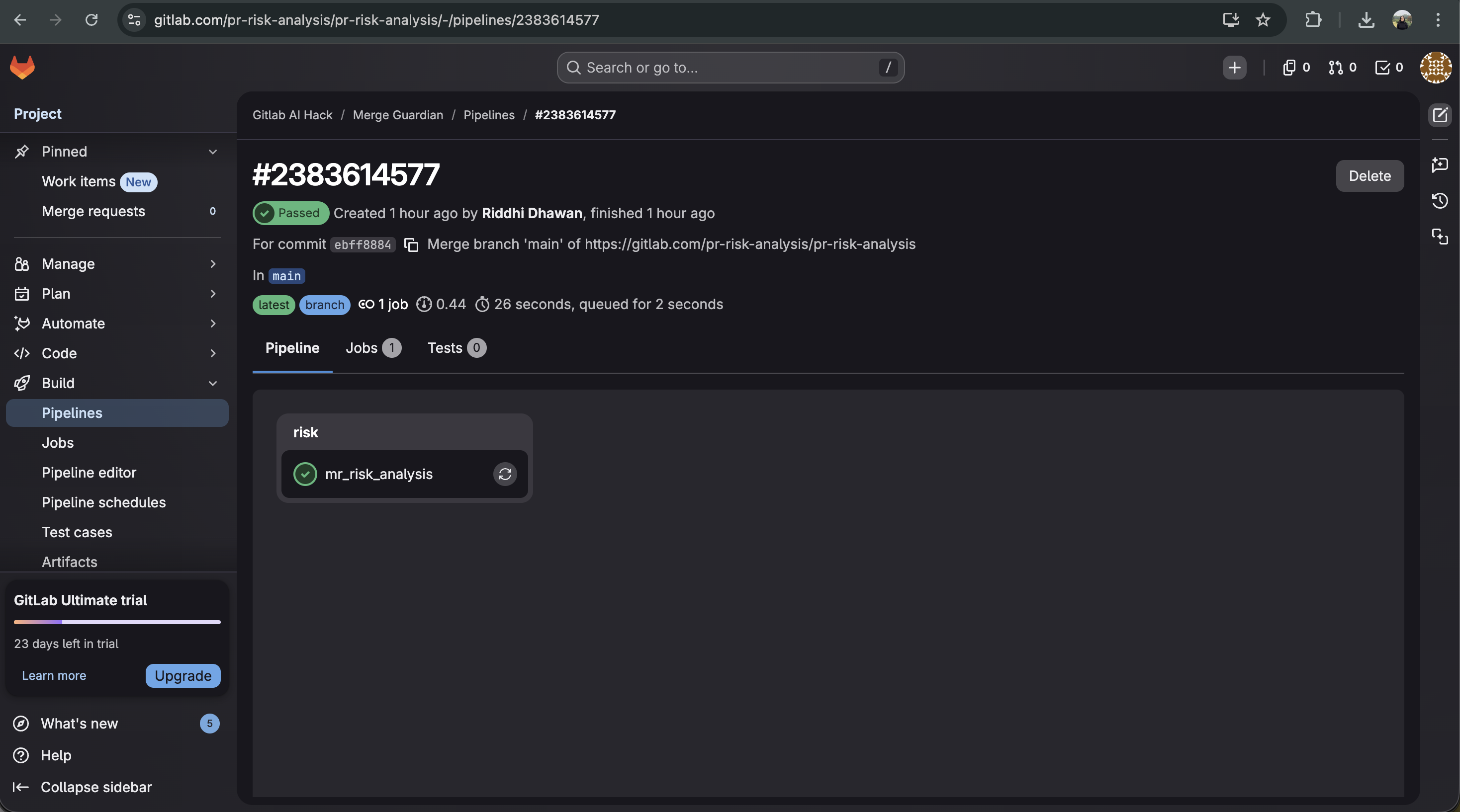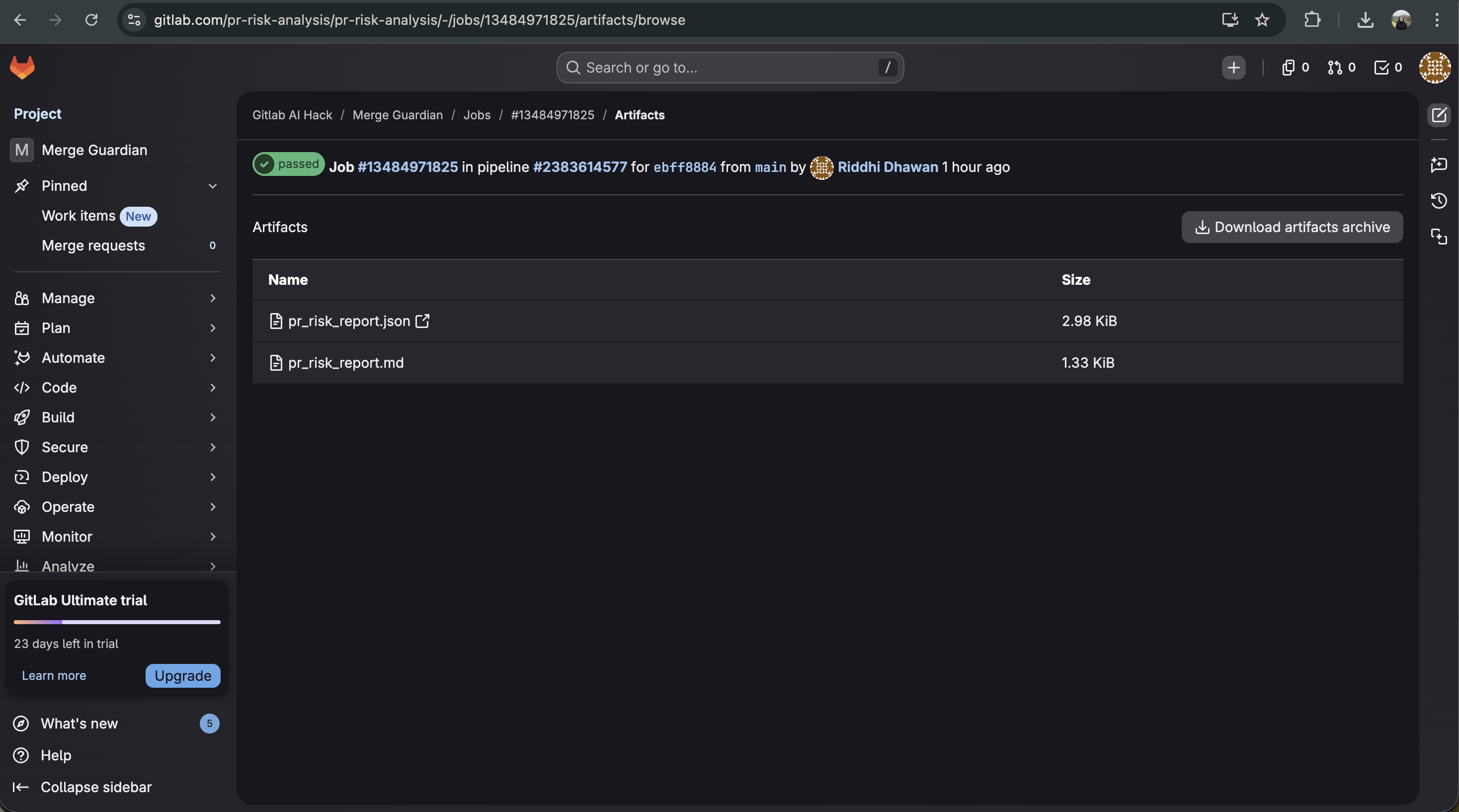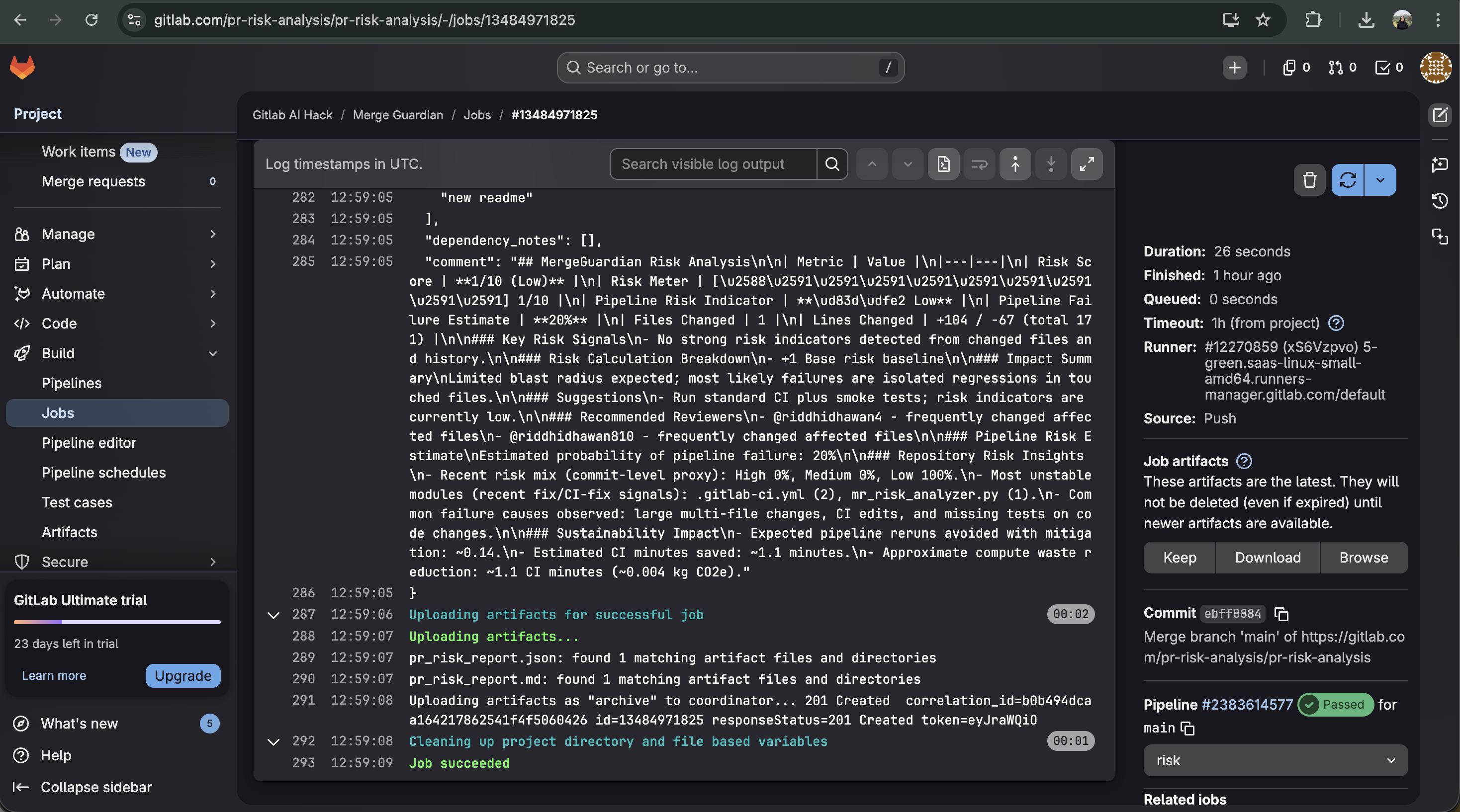 Built an end-to-end automated risk intelligence workflow, not just a static report script. Delivered dual outputs for both humans and automation systems. Added reusable MR note updating to avoid duplicate comments and keep discussion clean. Included practical reviewer suggestions and sustainability-oriented CI waste insights. Made the pipeline robust enough to keep providing value even with partial data.
