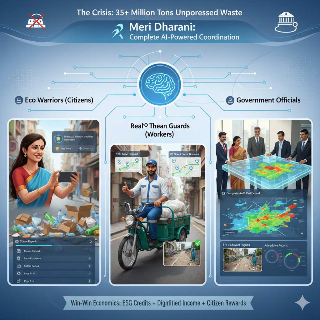 Meri Dharani is an AI-powered smart waste management ecosystem that connects citizens, cleanup workers, and government officials on one real-time platform.