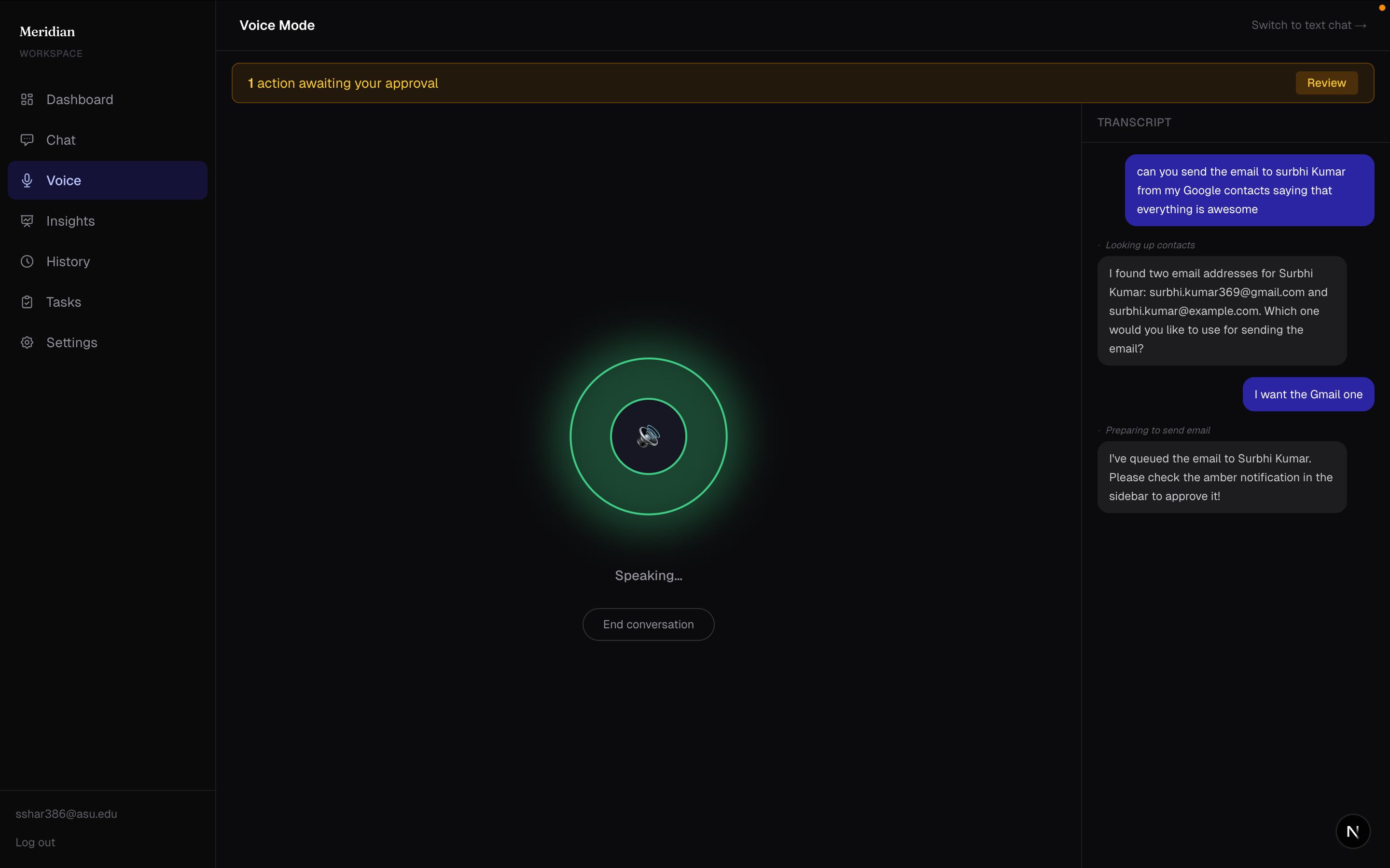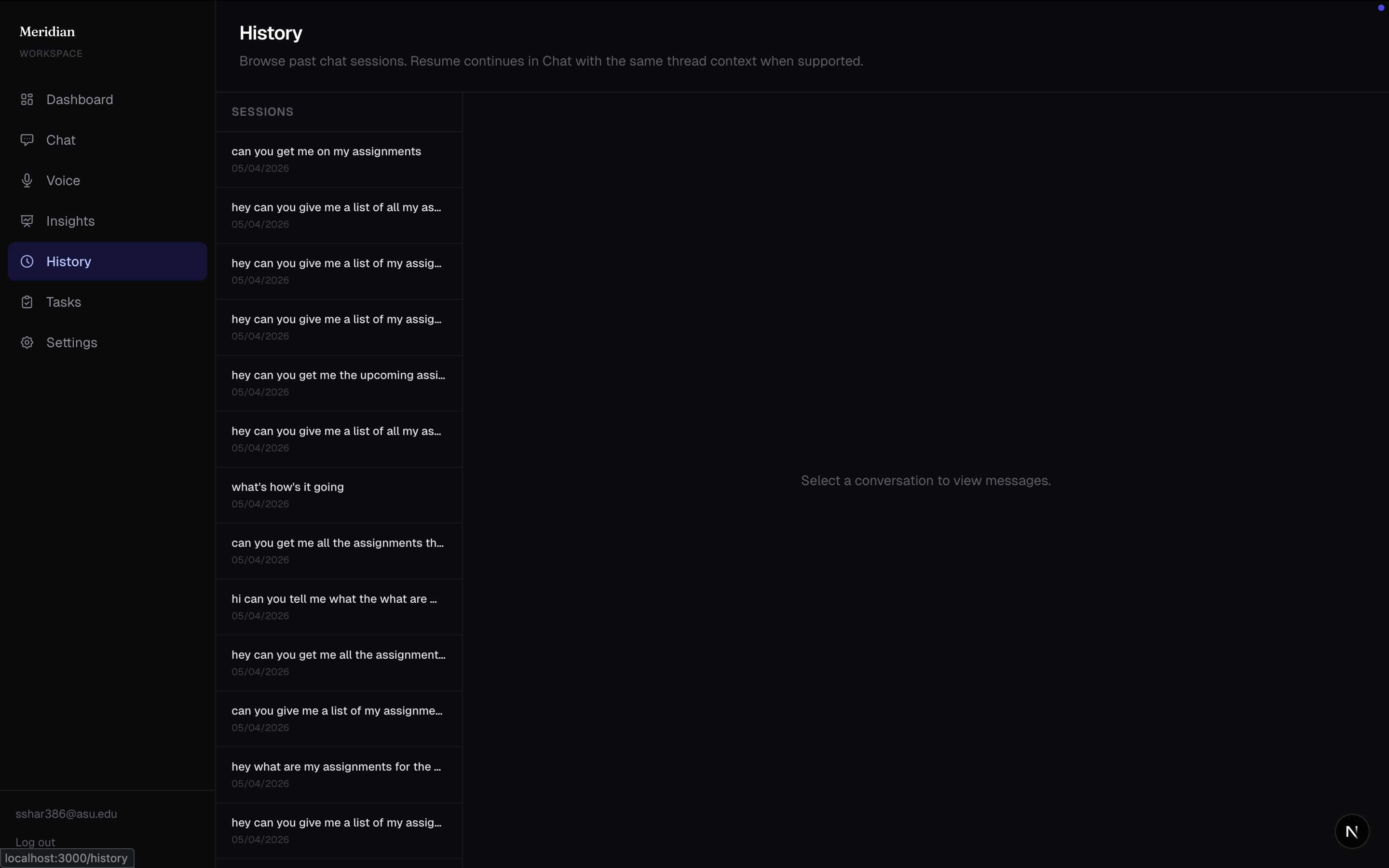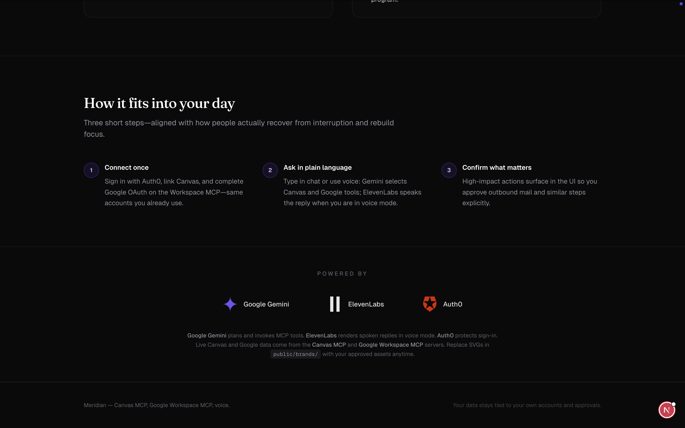 What's next for Meridian :- Next, we want to add a voice agent, smoother approval-based actions, and workflows like finding a file in Drive and submitting it directly to Canvas. Our goal is to make Meridian feel like a true everyday student assistant.
