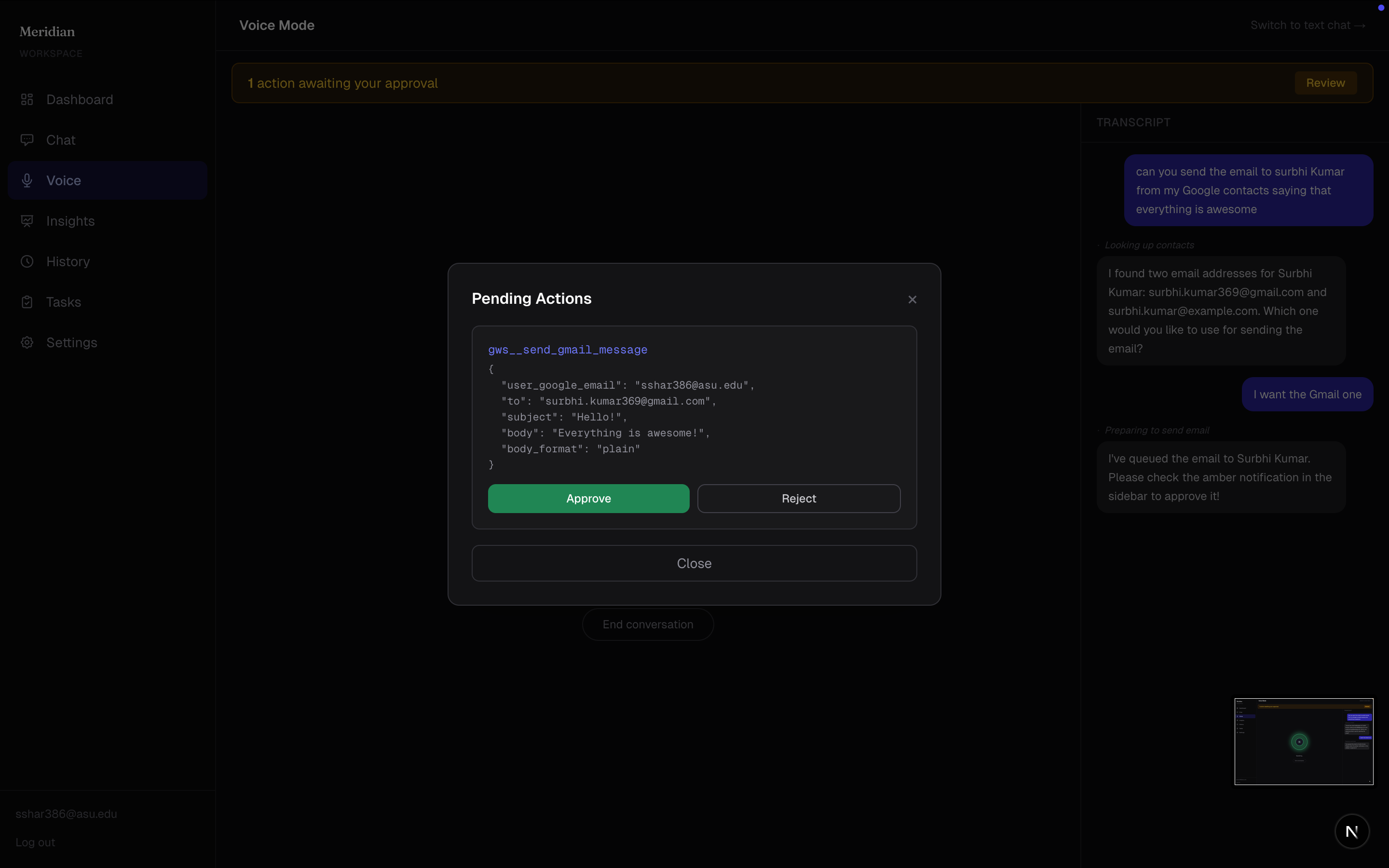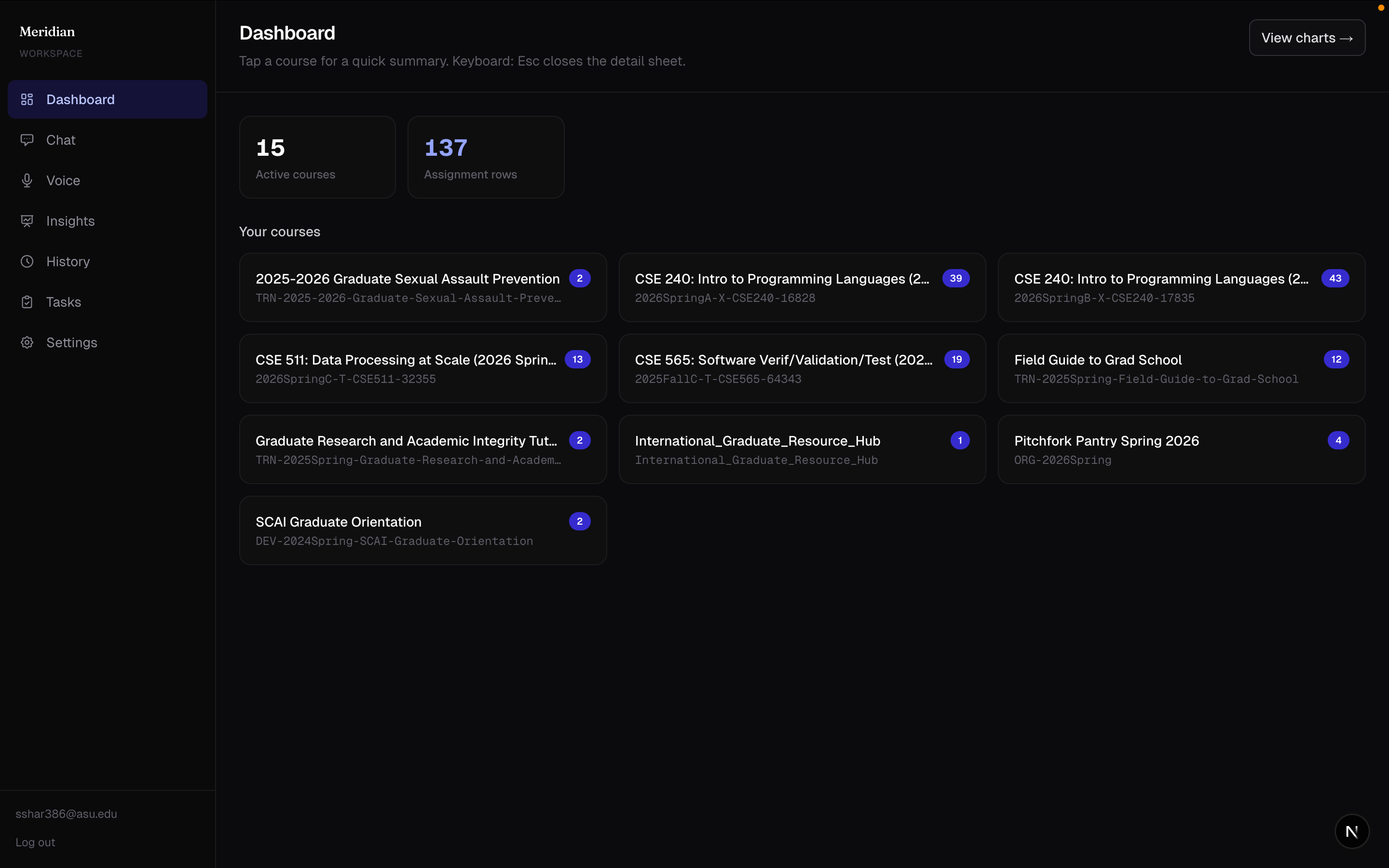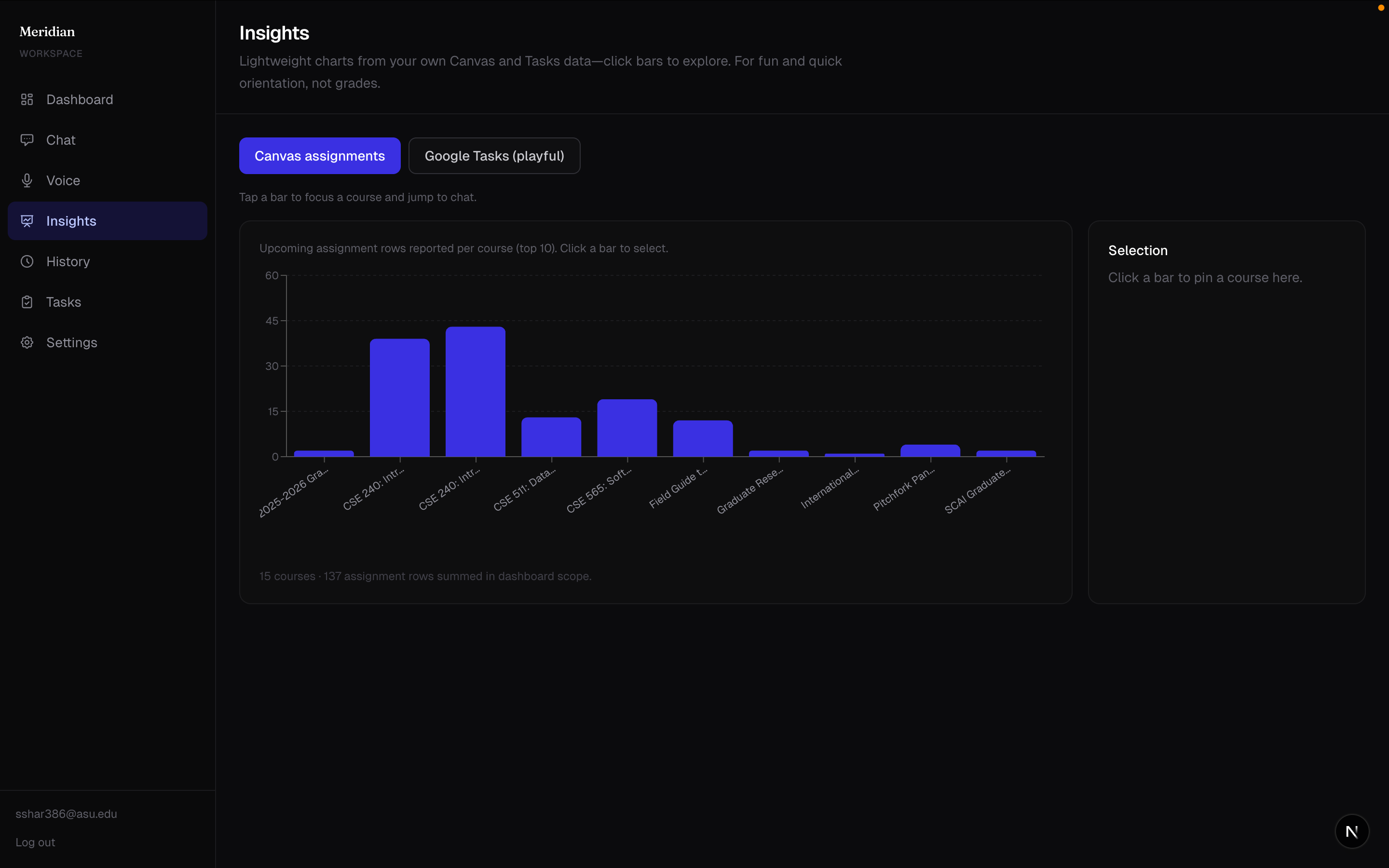 What's next for Meridian :- Next, we want to add a voice agent, smoother approval-based actions, and workflows like finding a file in Drive and submitting it directly to Canvas. Our goal is to make Meridian feel like a true everyday student assistant.
