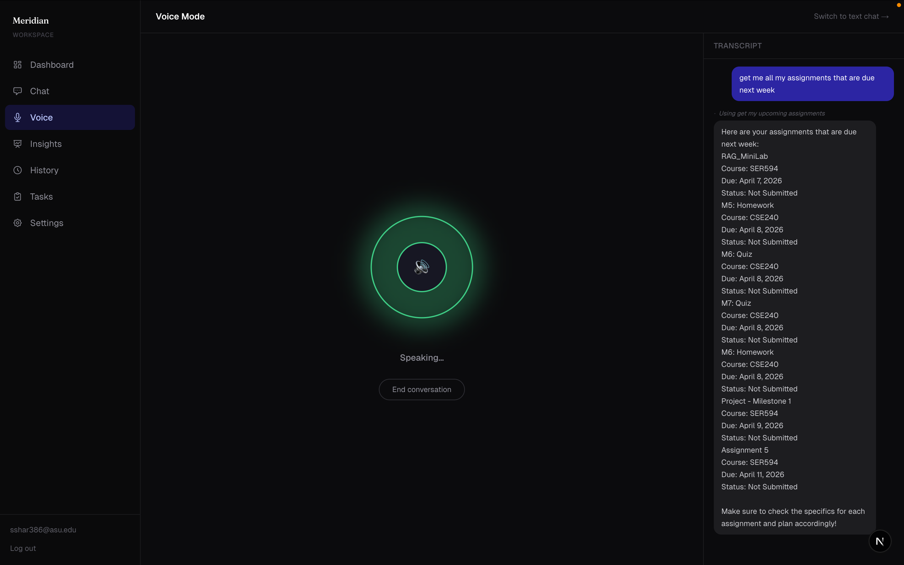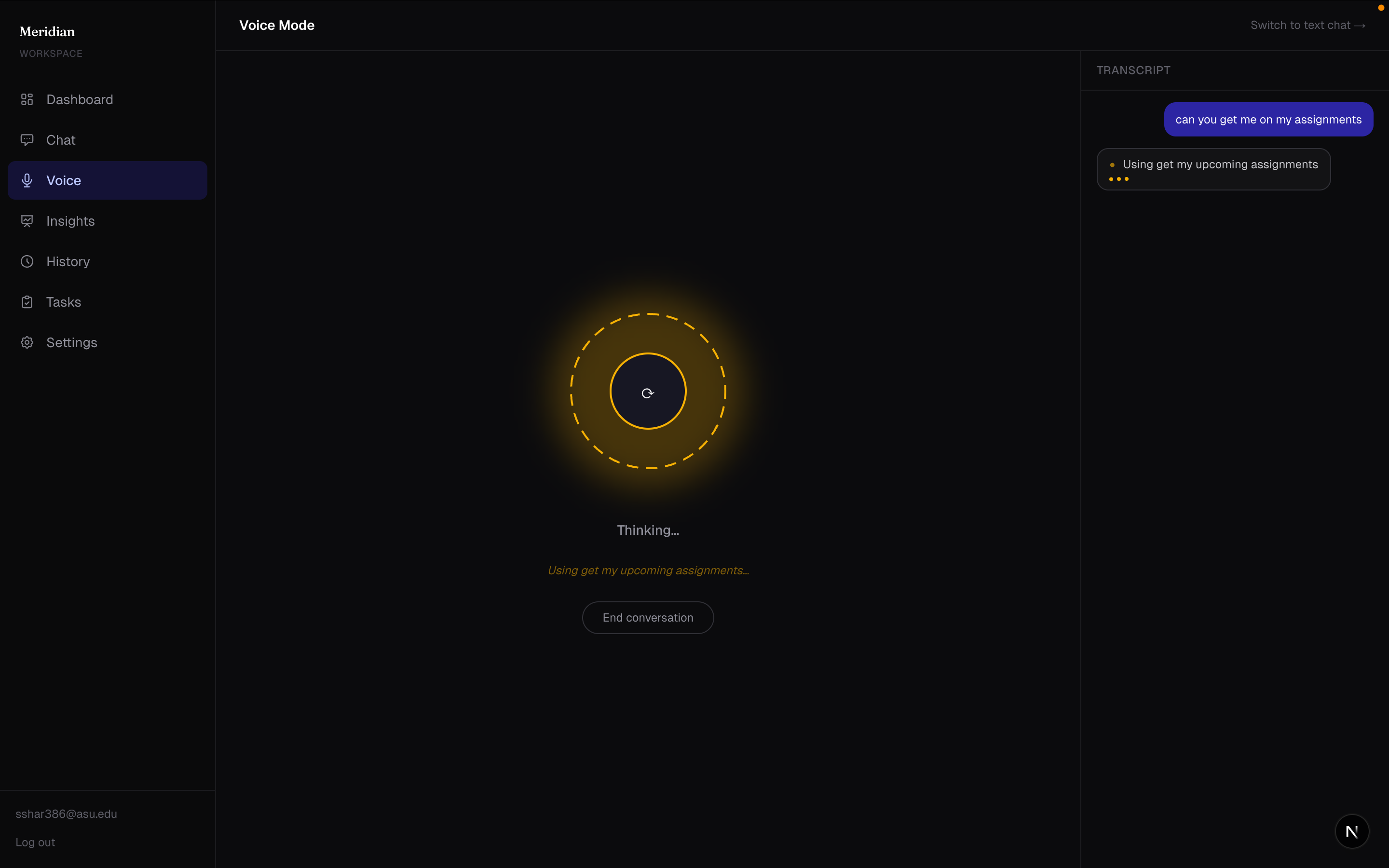 Inspiration :- As students at ASU, we wanted to build something that solves the everyday chaos of switching between Canvas, Calendar, Drive, mail, and tasks. That’s why we created Meridian, one AI assistant for the entire academic workflow.