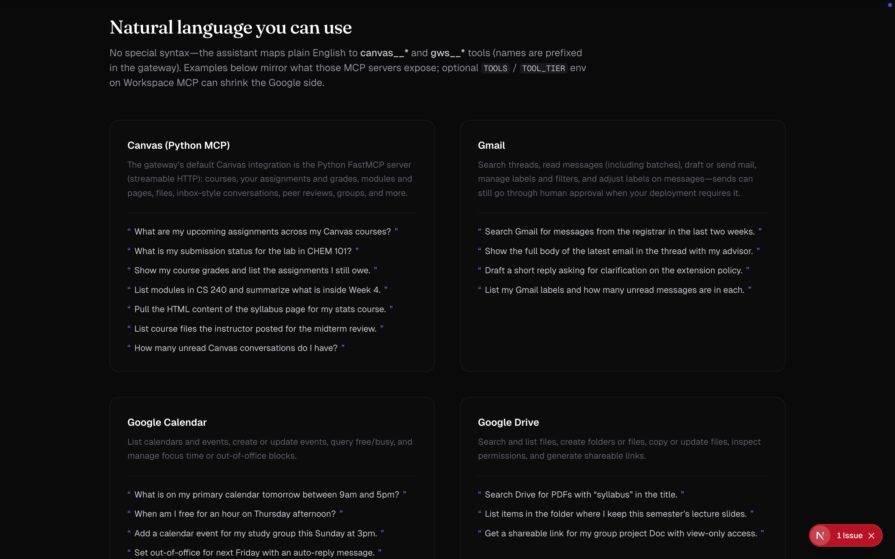 What it does :- It is a multi-agent, multi mcp orchesterated system which helps students connect Canvas LMS and Google Workspace into one assistant, so students can access assignments, grades, files, schedules, and communication in one place. It turns fragmented tools into one unified academic experience.