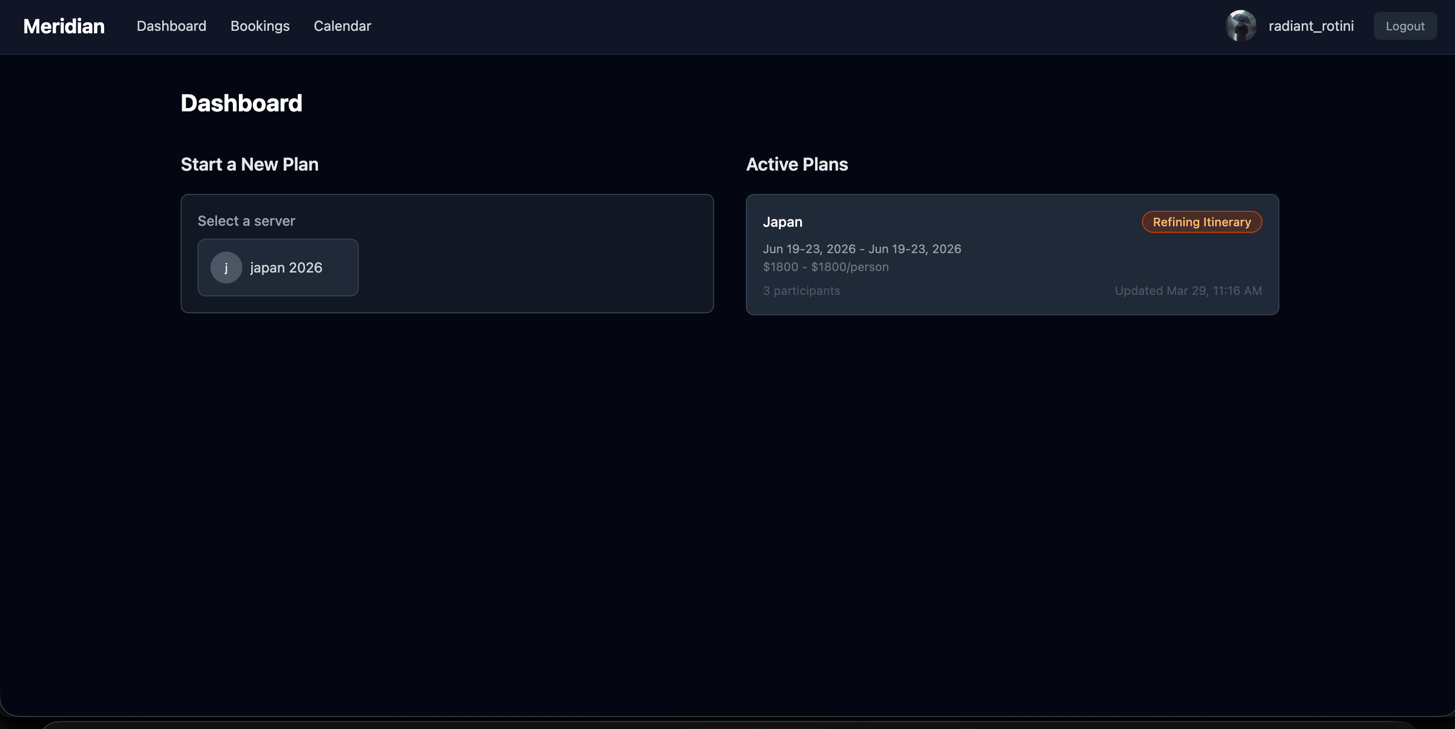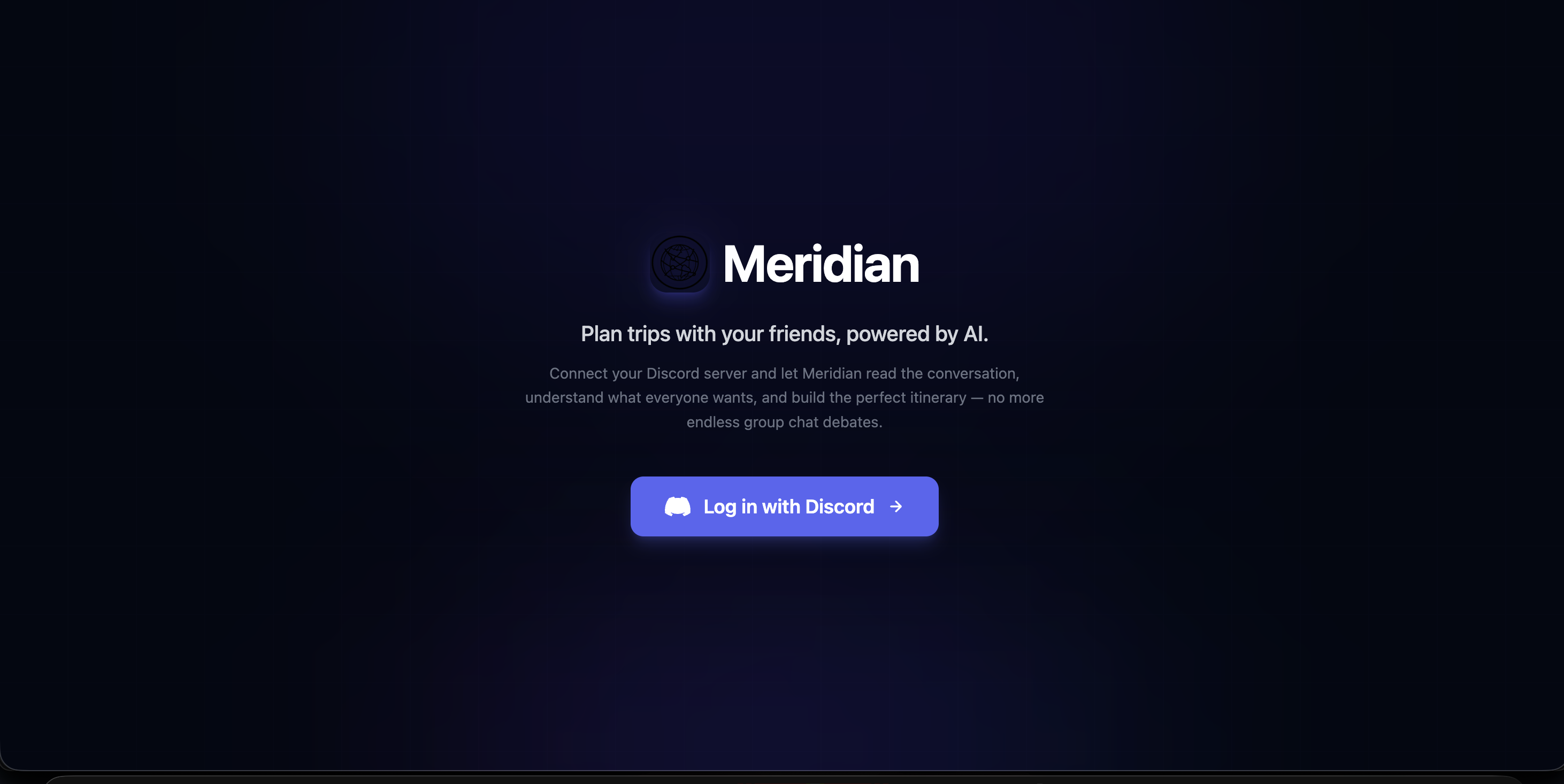 Meridian reads the messages within a discord group chat and uses that information to help resolve conflicts, develop an itinerary, and monitor bookings for the group. Schedules don't line up? Meridian can handle that. Too lazy to do research? Meridian isn't. Can't find flight timings? Meridian tries. Meridian creates polls to gauge interest and keeps the group chat updated on the current state of affairs, forcing plans to meet fruition.