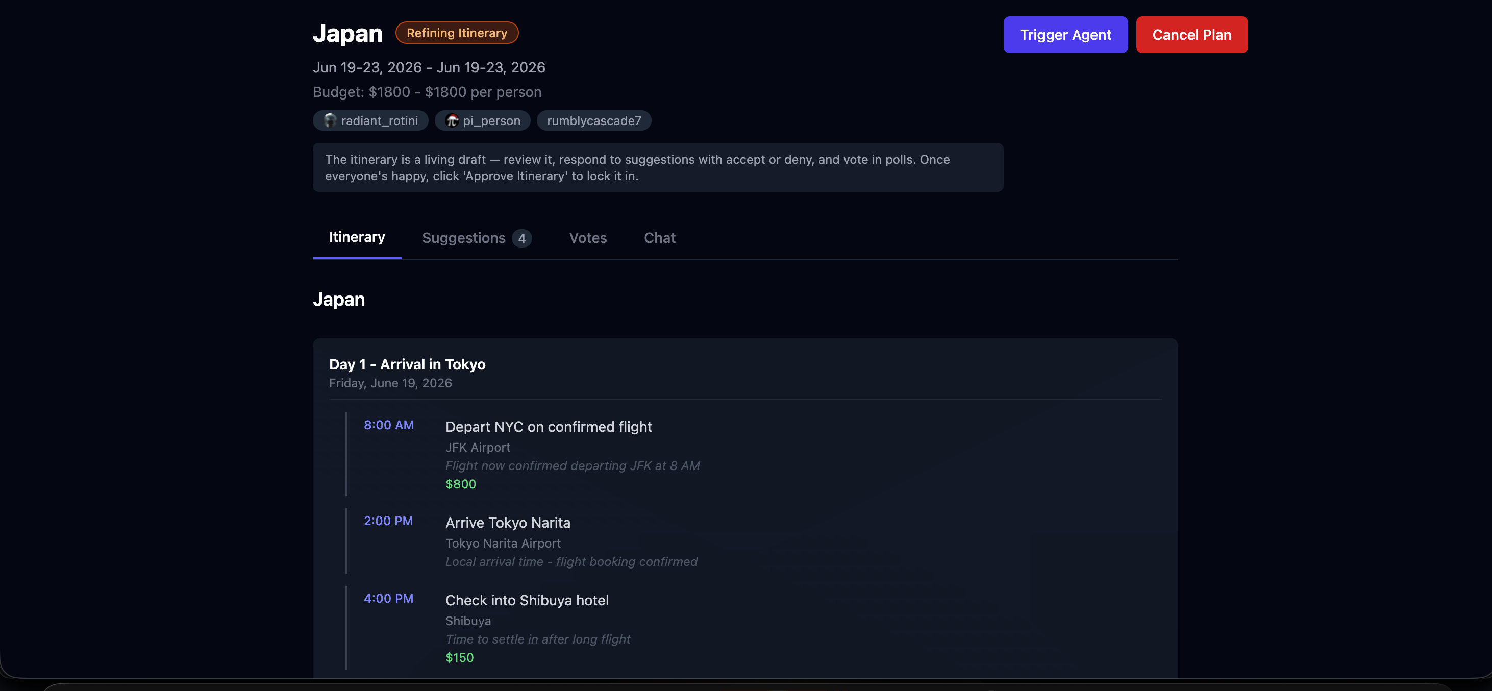 Our platform currently supports scraping messages and planning trips from Discord. In the future, we would like to add this to iMessage or other messaging platforms (Whatsapp, WeChat, etc). We would also like to incorporate weather information from OpenWeather so the AI agents can make more informed decisions for travel plans (e.g. flagging rainy days, suggesting indoor alternatives, finding best days for outdoor activities).