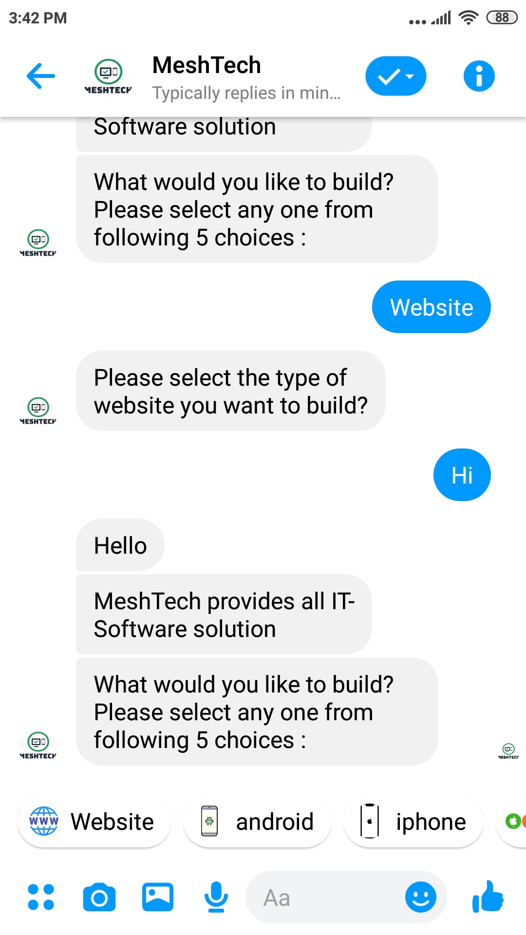 This automation bot provides options for user to build a website or/and a mobile application. For "Business" website user just have to enter the details which are asked by the bot and within minutes user can preview their website and can finalize the purchase by contacting MeshTech. For all other website and mobile application MeshTech provides "Automated Time and Cost calculation" based on requirement given by user