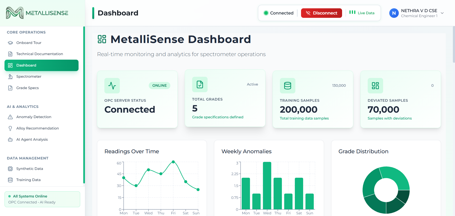 Key capabilities include: Real-time monitoring of chemical composition Detection of deviations from target metal grades AI-generated alloy correction recommendations Human-in-the-loop approval and override system Complete logging and traceability of decisions Instead of automating the process entirely, MetalliSense acts as a smart assistant for metallurgists, helping them make faster and more accurate decisions.