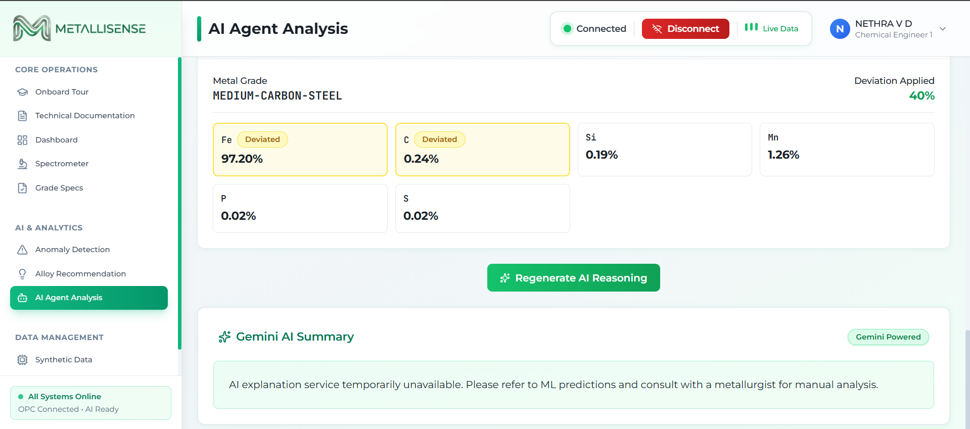 Key capabilities include: Real-time monitoring of chemical composition Detection of deviations from target metal grades AI-generated alloy correction recommendations Human-in-the-loop approval and override system Complete logging and traceability of decisions Instead of automating the process entirely, MetalliSense acts as a smart assistant for metallurgists, helping them make faster and more accurate decisions.