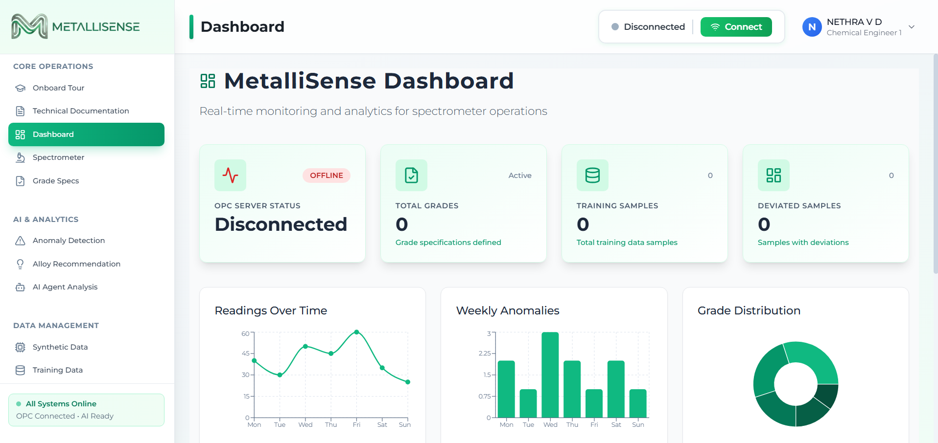 Key capabilities include: Real-time monitoring of chemical composition Detection of deviations from target metal grades AI-generated alloy correction recommendations Human-in-the-loop approval and override system Complete logging and traceability of decisions Instead of automating the process entirely, MetalliSense acts as a smart assistant for metallurgists, helping them make faster and more accurate decisions.