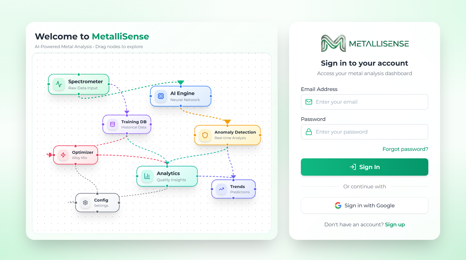 METALLISENSE-AI INSPIRATION: Modern foundries depend on precise control of chemical composition to produce metals with the required strength, durability, and quality. Even a small deviation in alloy composition can lead to scrap, re-melting, wasted materials, and increased energy consumption. Traditionally, metallurgists analyze spectrometer readings and manually decide how much alloy should be added to correct the composition. While this process relies on valuable expertise, it can be time-consuming and may vary across operators or shifts. At the same time, industrial environments generate large amounts of real-time data from sensors and spectrometers. We were inspired by the idea of using Artificial Intelligence and Industry 4.0 technologies to turn this data into actionable insights. This led to the creation of MetalliSense AI, an intelligent system designed to assist metallurgists by analyzing real-time composition data and recommending precise alloy corrections while keeping humans in control.