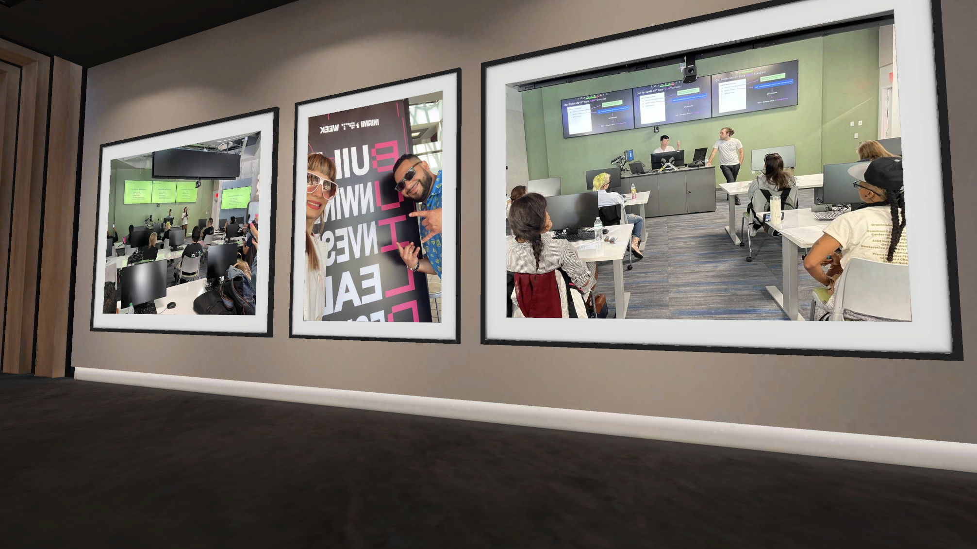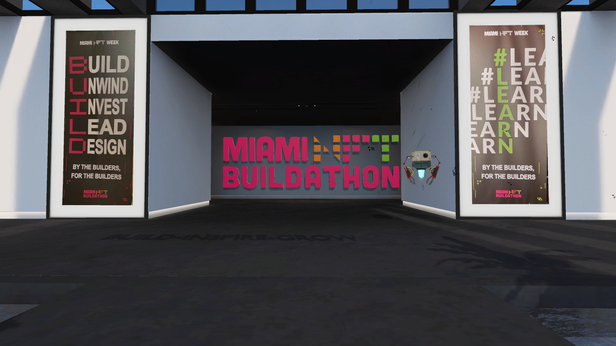 Advertisement of the event , Miami NFT Buildathon and the builders, sponsors and judges involved The space can be used to host events and showcase projects The Space will remain live after the event is completed in www.spatial.io Community connections