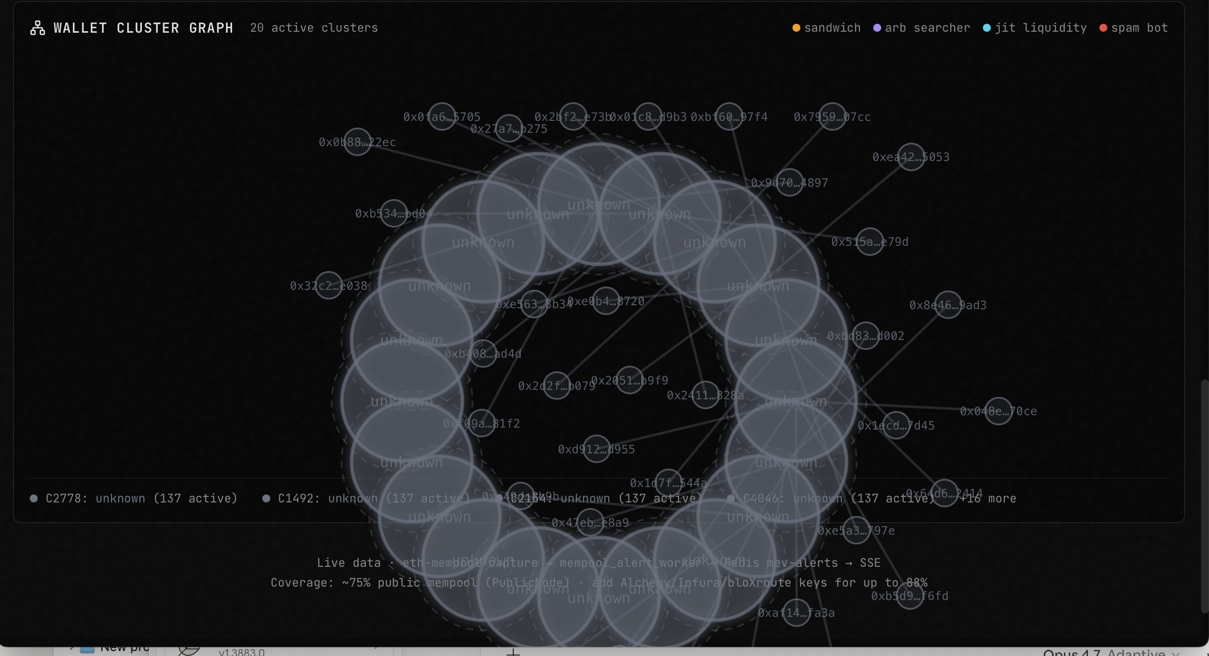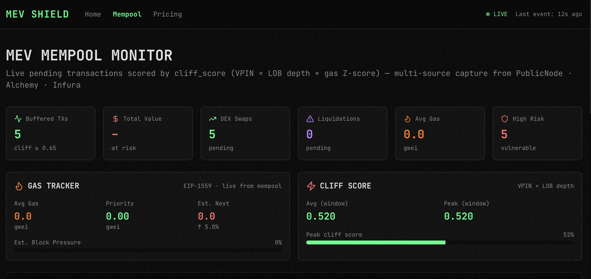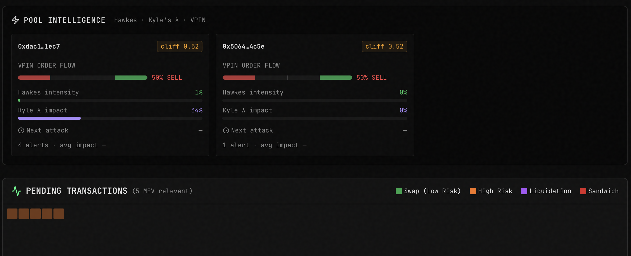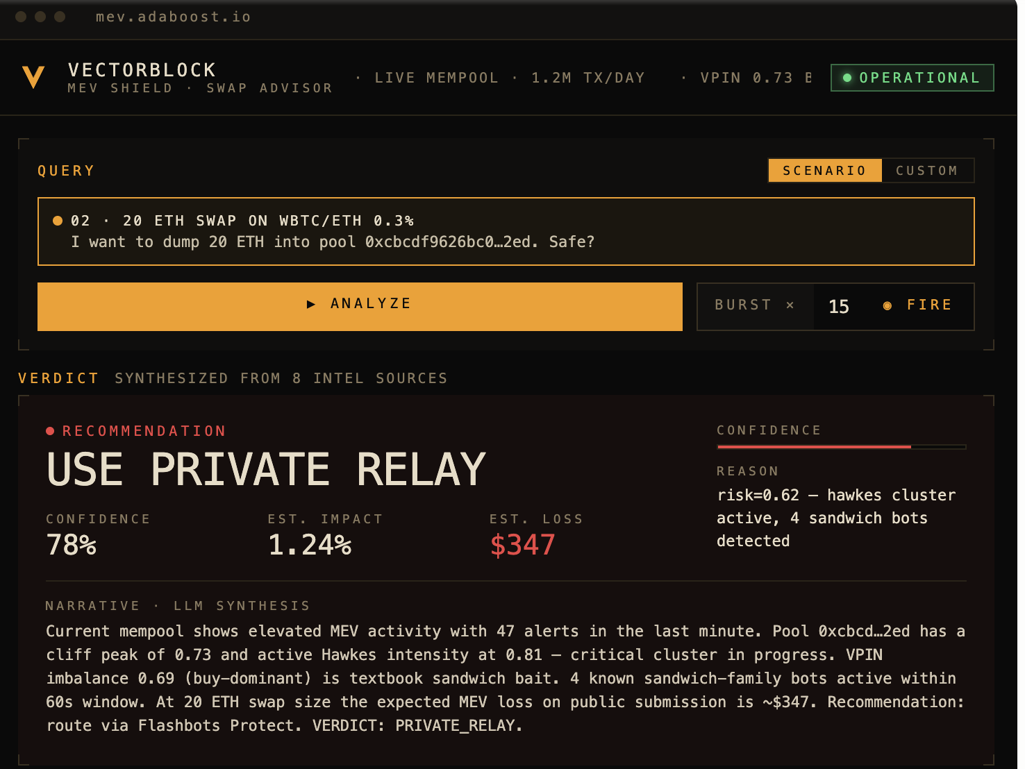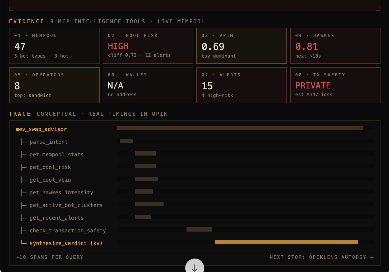 InspirationEvery DEX trader pays a hidden MEV tax — 50 to 150 basis points on volatile pairs, silently extracted by sandwich bots in the public mempool. Today, avoiding it requires deep mempool analytics, bot taxonomy, and Hawkes-process modeling — all behind institutional paywalls. We wanted to put that intelligence in an agent anyone can ask: "Should I route this swap publicly, or through Flashbots?"What it doesMEV Swap Advisor analyzes live Ethereum mempool data and recommends whether to submit a swap publicly or through a private relay. A user asks a natural-language question — "Swap 20 ETH on pool 0xcbcd...2ed, safe?" — and the agent calls 8 MCP intelligence tools in parallel against our live mempool index: pool risk scoring, VPIN order-flow toxicity, Hawkes intensity, active bot clusters, wallet reputation, and transaction safety simulation. An LLM synthesizes the evidence into a single verdict — PRIVATE_RELAY or PUBLIC_OK — with a confidence score and estimated MEV loss in USD. Every step is traced in Opik, so you can see exactly how the agent reached its conclusion.How we built itThe stack is three tiers connected over a shared Docker network:Intelligence layer. An Ethereum mempool capture pipeline streams raw pending transactions into Redis and Neo4j, building a real-time index of pool activity, bot clusters, and risk signals. This feeds an MCP server that exposes 8 tools over SSE.Agent layer. A FastAPI service consumes all 8 MCP tools via a short-lived SSE client session per request. It runs an intent-parsing step, 6 parallel tool calls, 2 sequential ones, and a final LLM synthesis. Every call is wrapped with Opik's @track decorator, producing ~10 spans per query under one parent trace. Inference runs on a local llama.cpp server, giving us full control over the model and zero external API costs.Presentation layer. A single-file React frontend served by nginx, proxying /api/* to the agent. Terminal-aesthetic design — dark charcoal, amber accents, corner brackets — to signal "production financial tool" rather than "AI demo." A burst mode fires N concurrent analyses to stress the inference backend while the observability layer records everything.Challenges we ran into Dependency conflicts. Our initial pins had fastapi==0.115.0 requiring starlette<0.39, while mcp==1.1.0 required starlette>=0.39. Unresolvable. Bumped both to newer versions. Custom llama.cpp patches going stale. Our llama.cpp build used three custom patches written months earlier against a specific commit. Upstream had refactored server.cpp extensively; patches no longer applied. We removed the custom telemetry patches and ran plain upstream llama.cpp — keeping /slots, /metrics, and /v1/*, which is everything our demo actually needed. Shared-library linking inside the runtime image. libllama.so was present as libllama.so.1 but the binary looked for the unversioned name. Wrote a bidirectional symlink loop so either direction works. Port collisions. Our inference server defaulted to :8080, which was already bound by an unrelated service. Remapped to :8096. MCP session lifecycle. Persistent SSE sessions across asyncio request boundaries are fragile. Chose a short-lived session per request — 100ms overhead in exchange for reliability. Accomplishments that we're proud of A working end-to-end agent that calls real on-chain intelligence, not mocked data. Every trace is backed by actual Ethereum mempool activity. Rich Opik trace granularity: 10 spans per query (1 parent + 2 LLM calls + 8 tool calls), with visible parallelism in the timeline. This is the kind of trace data that makes observability actually useful. A frontend that looks like a product, not a hackathon project. Judges remember what they saw. Burst mode: one button fires 15 concurrent analyses and drives the inference backend into slot contention, making the observability story tangible rather than abstract. What we learned Separation of concerns pays off under time pressure. Keeping the mempool intelligence, inference, agent, and UI as independent containers connected by a shared Docker network meant that when any one piece broke, we could fix it in isolation. If we had merged them into a monolith, the custom-patch failure would have blocked the whole demo. Observability is a UX feature, not a debugging tool. Once we had Opik traces visible, we caught three bugs in the agent's tool-call ordering that would have been invisible otherwise. The trace view became our primary debugging interface. Regex before LLM is underrated. The intent-parsing step has a regex pre-pass that handles 90% of queries without touching the model. That's 90% of queries with zero token cost and millisecond latency. Patch-based build pipelines age badly. Upstream projects move; patches rot. Where possible, use upstream as-is. What's next for mev-swap-advisor OpikLens. A correlator service that joins Opik traces with llama.cpp KV-cache telemetry by timestamp, so any slow trace can be auto-diagnosed: "Your p99 spike happened because KV was at 87%, fragmentation 43%, 4 concurrent prefill-heavy requests." A Hawkes-process predictor projects next saturation event. Live on-chain integration. Replace pool analytics mocks with direct queries against our existing Vectorblock Vertica store of 20+ years of microstructure data. Streaming verdicts. Move the synthesis step to token-level streaming so users see the verdict forming in real time instead of waiting 5-8s. explain_slow_trace MCP tool. One new tool in our existing MCP bridge, callable from Claude Desktop: "Why was my last agent call slow?" → Claude returns the autopsy conversationally. Autonomous monitoring mode. An agent that polls pool risk continuously and emits alerts when cliff_score crosses a threshold, so users don't have to ask — they get notified.