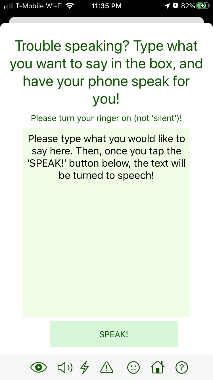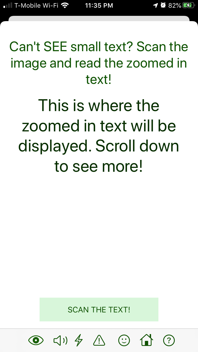 I built this app using Swift 5 and Xcode 11. I first designed the user interface of the app using the SwiftUI Storyboard, where I can implement buttons, images, and more elements. Then, I added code in the backend of the app, so that the scanned text can be converted to an enlarged font, convert typed text to speech, analyze the tests for headaches and seizures, and track the moods. Then, to test the app, I connected it to my dad's iPhone8, and was able to see the app's function, to make changes.