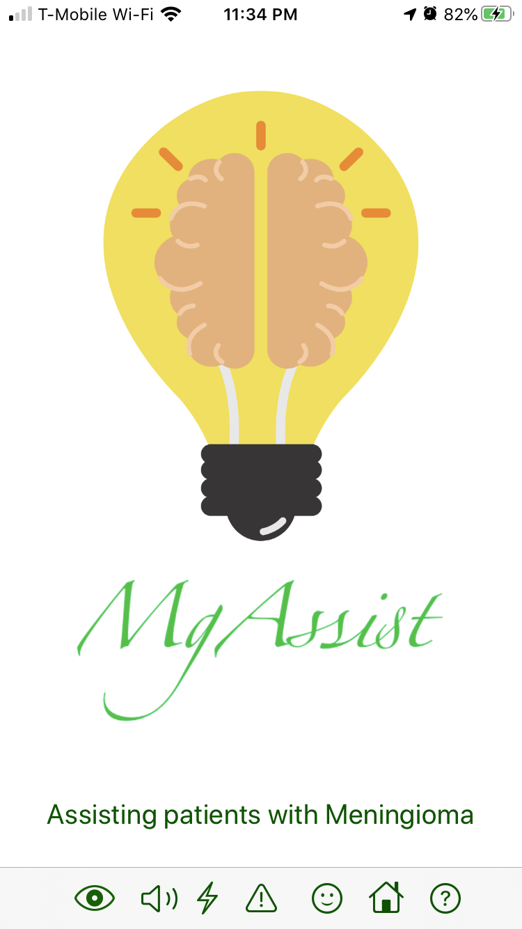 MgAssist is an app that assists in the recovery management process of those with meningioma brain tumor. It is a tool to assist people with the different symptoms of meningioma (such as vision impairments, speaking/hearing impairments, headaches, and seizures) and allows doctors to track patients’ progress. The app uses algorithms to convert scanned text to an enlarged font, convert typed text to speech, provide a test to detect a possible risk of headaches or seizures in the near future, and track patients' mood for doctors to analyze trends.