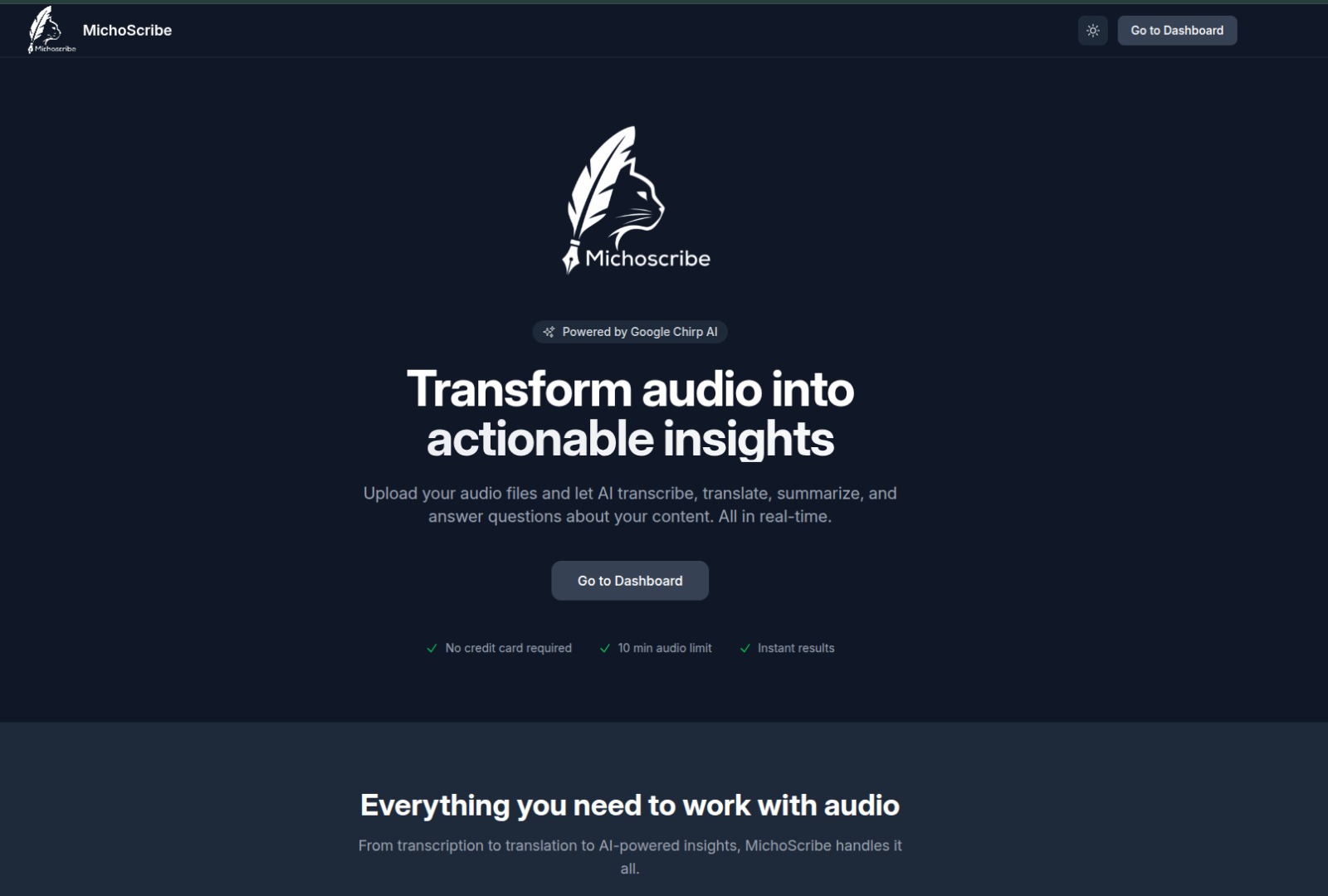 What it does MichoScribe is an AI-powered audio intelligence platform. It transforms spoken content into actionable, searchable, and exportable knowledge in real-time.