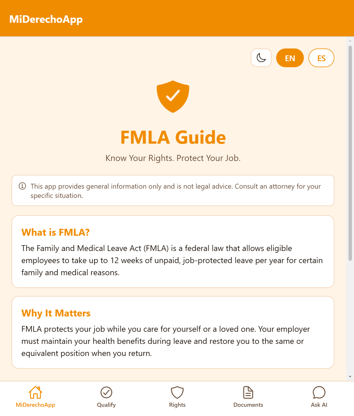 Every day, workers across the United States go through some of the hardest moments of their lives — a serious illness, a new baby, a parent who needs care — without knowing that federal law protects their job during those moments. The Family and Medical Leave Act has existed since 1993, yet countless employees have never heard of it. One of our team members works at Sedgwick, a leading claims management company, and processes FMLA claims professionally every day. The most heartbreaking part of the job is not the paperwork — it is the phone calls from employees who had no idea they had this right in the first place. Workers who have been at the same company for years, paying into their benefits, raising families, and never once being told that their job could be protected during a medical crisis. This is not a knowledge gap that should exist. Employers are required to inform employees of their FMLA rights, yet in practice, many workers — especially Spanish-speaking workers in communities like the Rio Grande Valley — fall through the cracks. We built MiDerechoApp to bridge that gap. Because knowing your rights should not depend on who you know, what language you speak, or whether you can afford an attorney.