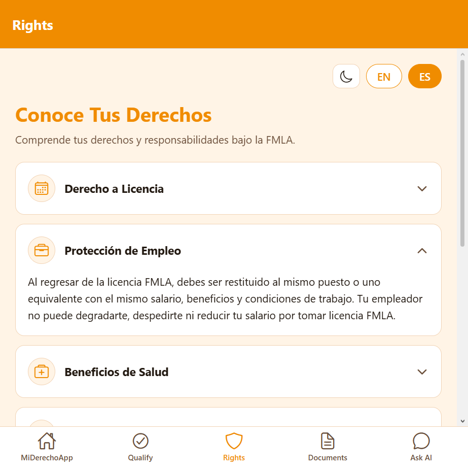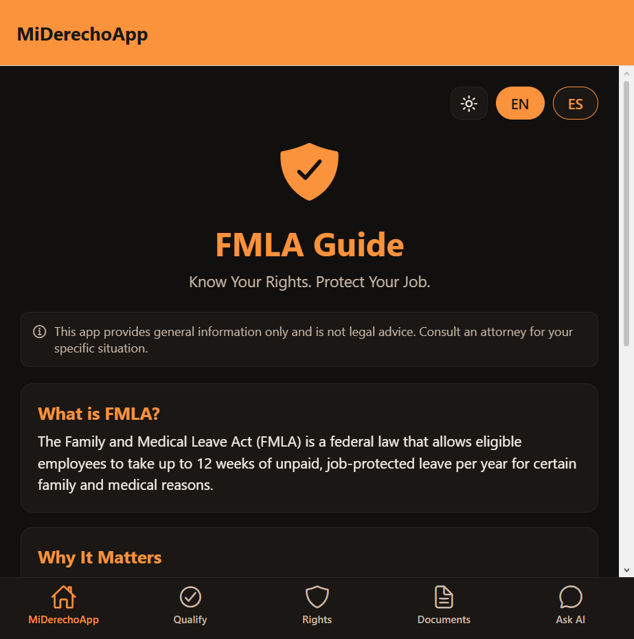 MiDerechoApp is a bilingual (English/Spanish) mobile and web application that puts FMLA knowledge directly into the hands of workers. The app features four core tools: