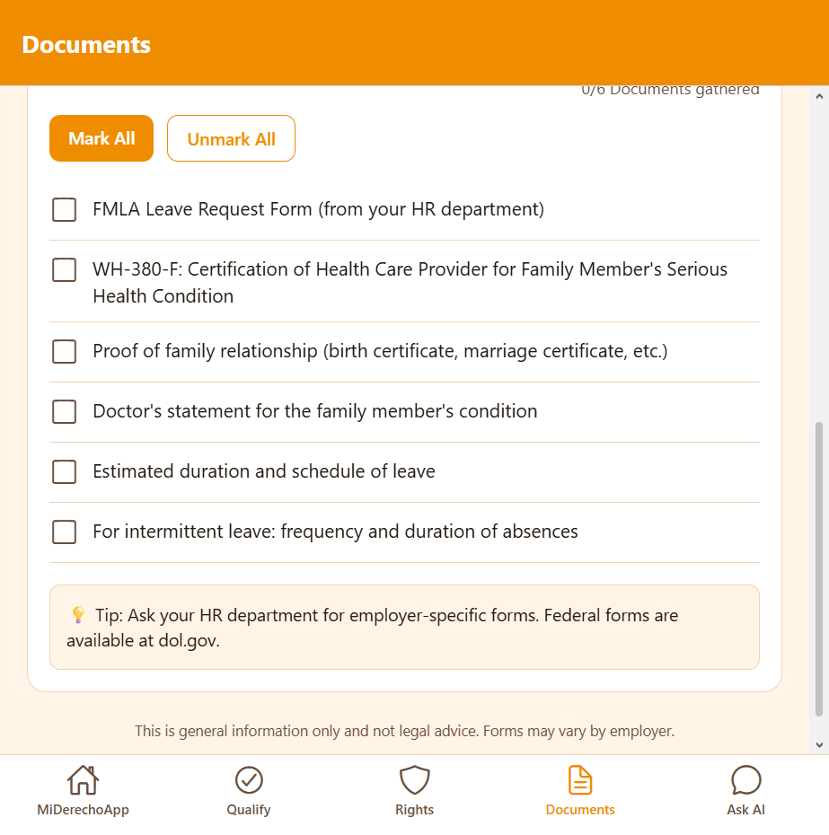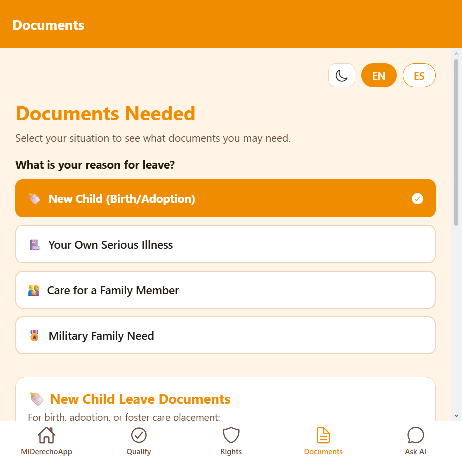 • Do I Qualify? — A step-by-step eligibility checker that walks employees through the four key FMLA criteria with a clear result and plain-language explanation. • Know Your Rights — Expandable information cards covering eight essential areas of FMLA rights, including job protection, health benefit continuation, anti-retaliation protections, and intermittent leave. • Documents Needed — An interactive checklist personalized to the employee’s specific situation: new child, serious illness, family care, or military family need — with a progress tracker to stay organized. • Ask AI Assistant — A Claude AI-powered chat assistant that answers specific FMLA questions in plain language, automatically detecting and responding in the user’s language — English or Spanish — with no configuration required. Every feature is available in both English and Spanish with a single tap, designed for workers who may be in the middle of a crisis and need clear answers fast.