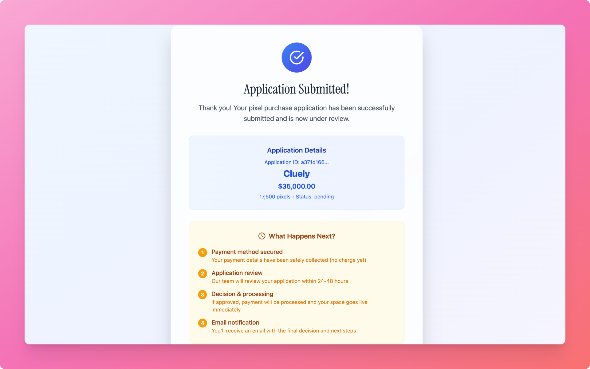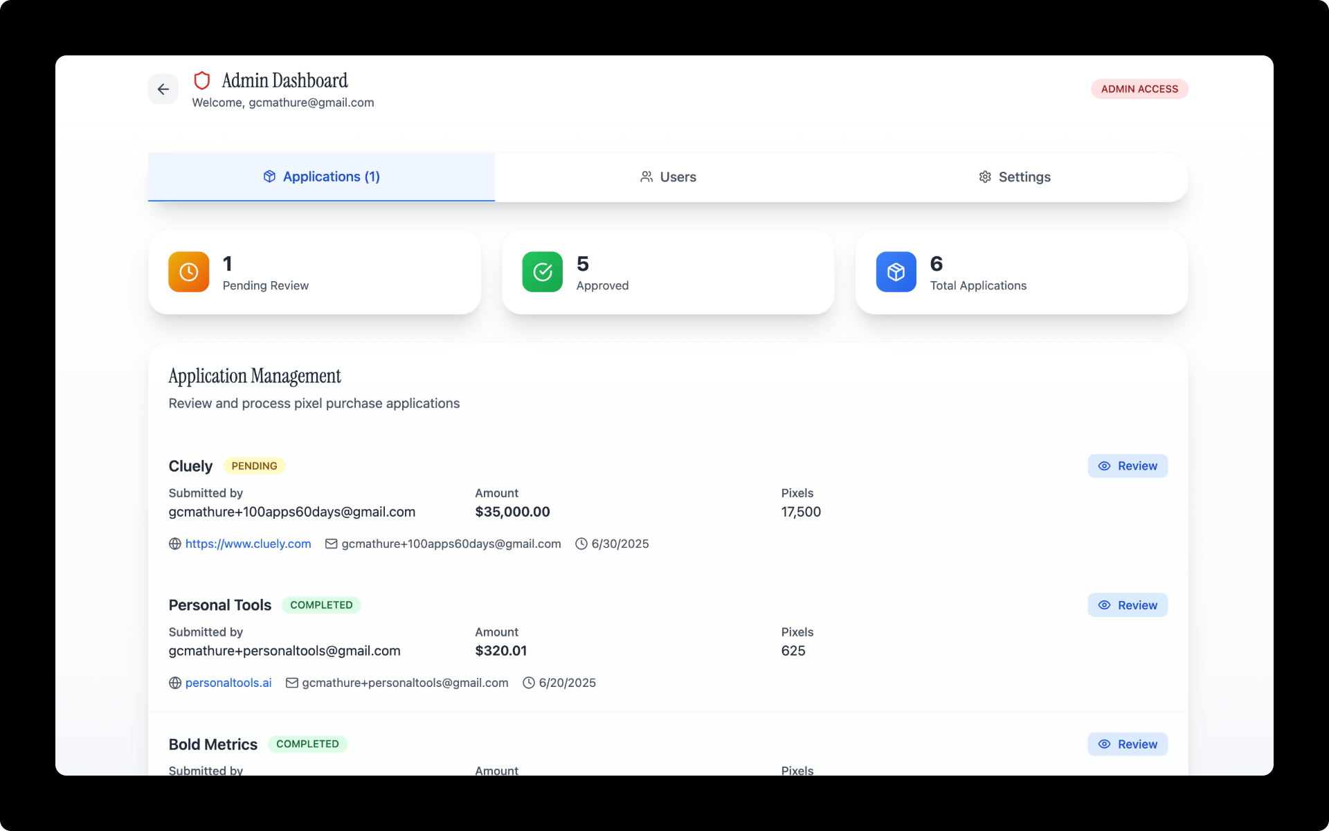 - Workflow: Applications move through a review and approval process powered by Edge Functions and database triggers. Admins manage the flow from submission to pixel assignment.