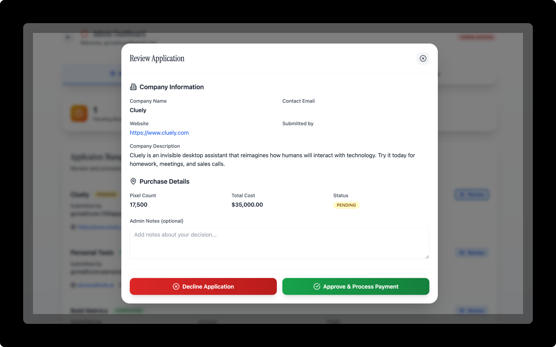 Admins review applications. Once approved, Stripe processes payment and logos go live. Each user gets a profile page to manage their pixels, logos, and company details.