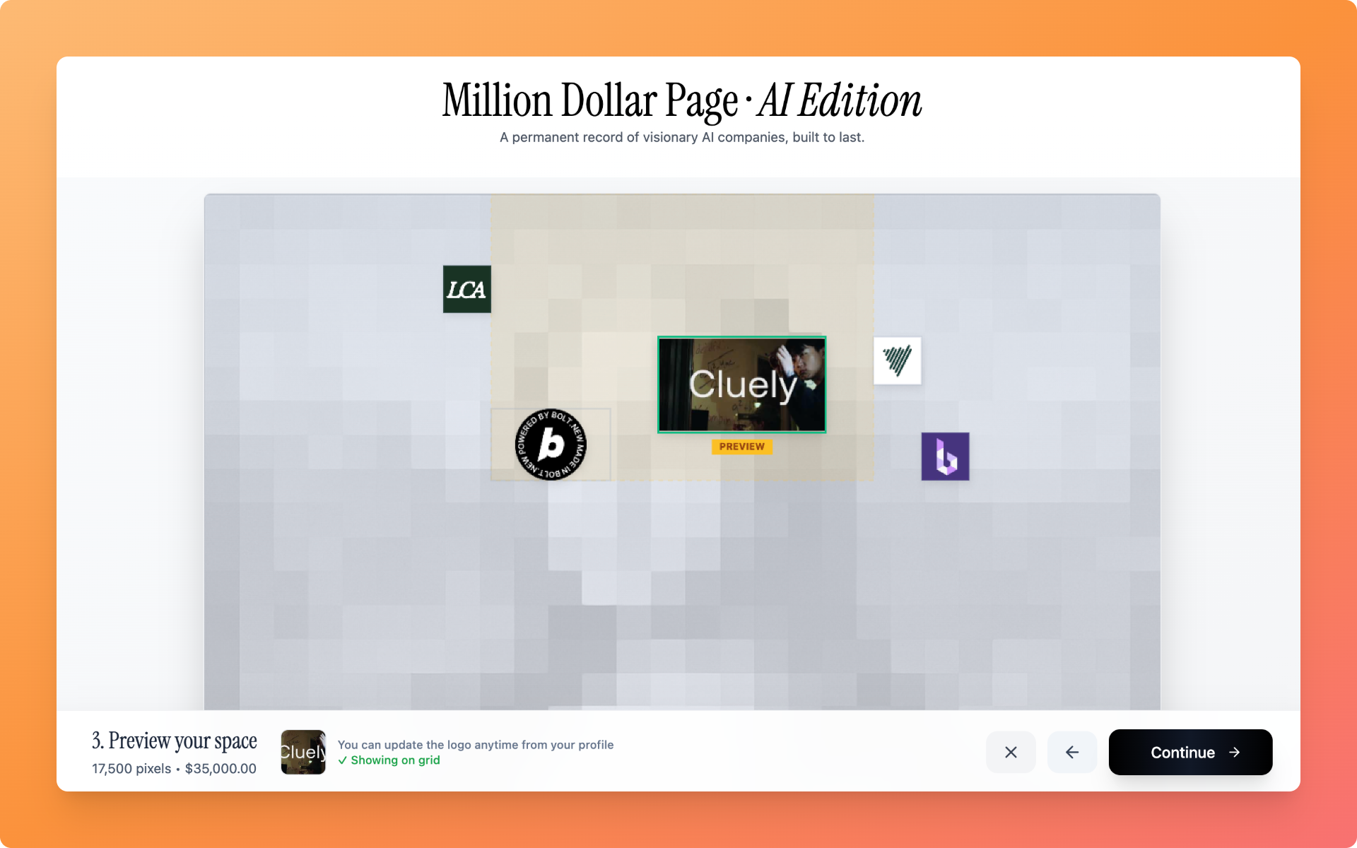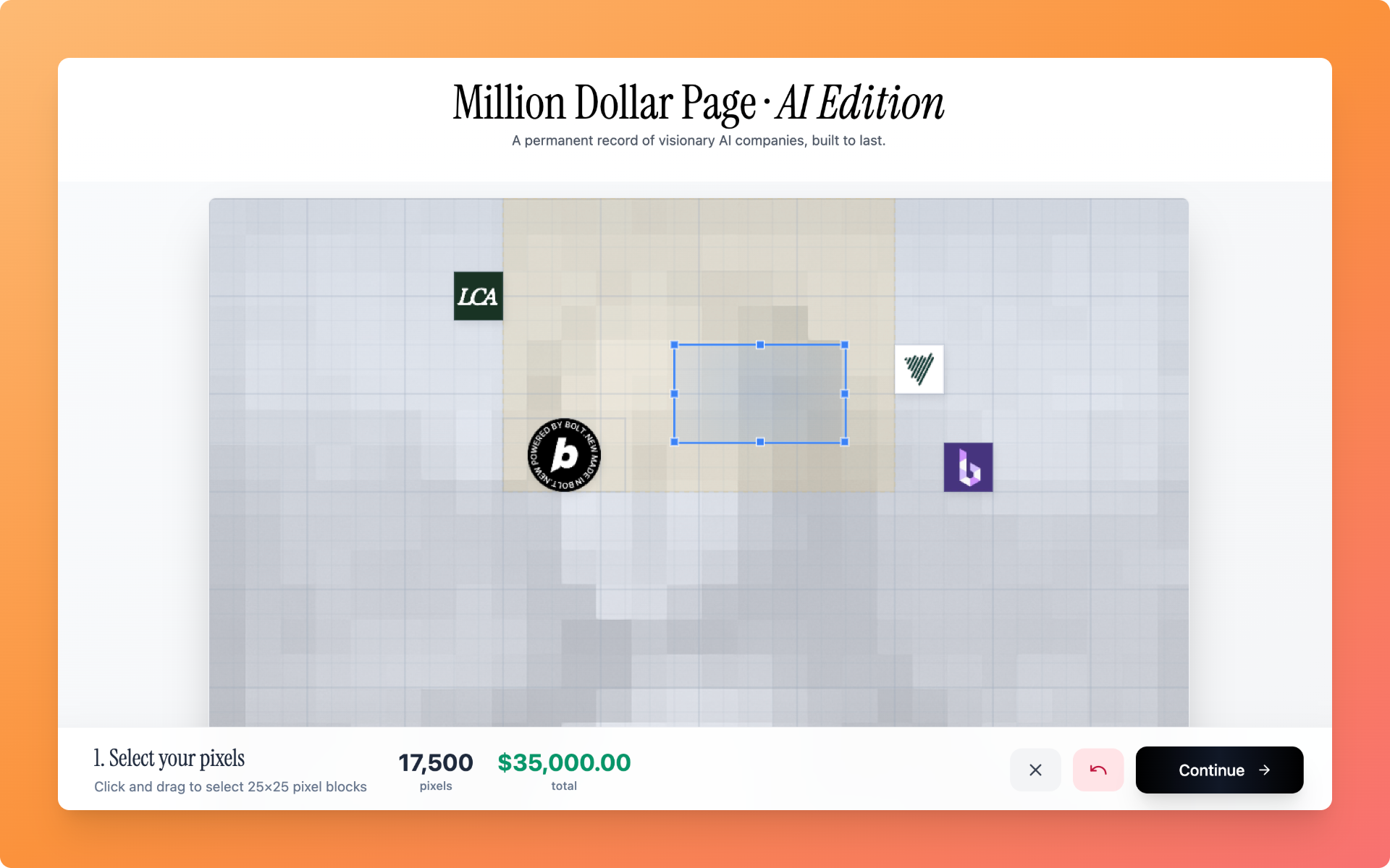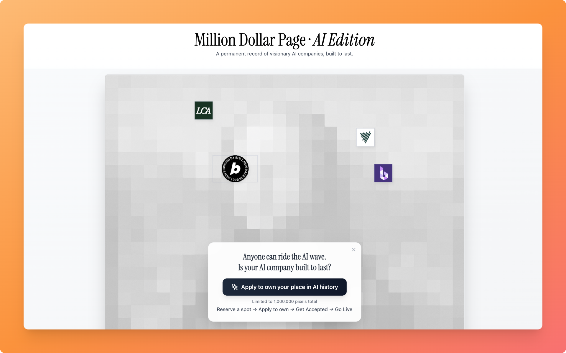 The Million Dollar Page – AI Edition was inspired by the original Million Dollar Homepage—a 1000x1000 pixel grid that let anyone buy online real estate for $1 a pixel. Simple. Bold. Memorable.