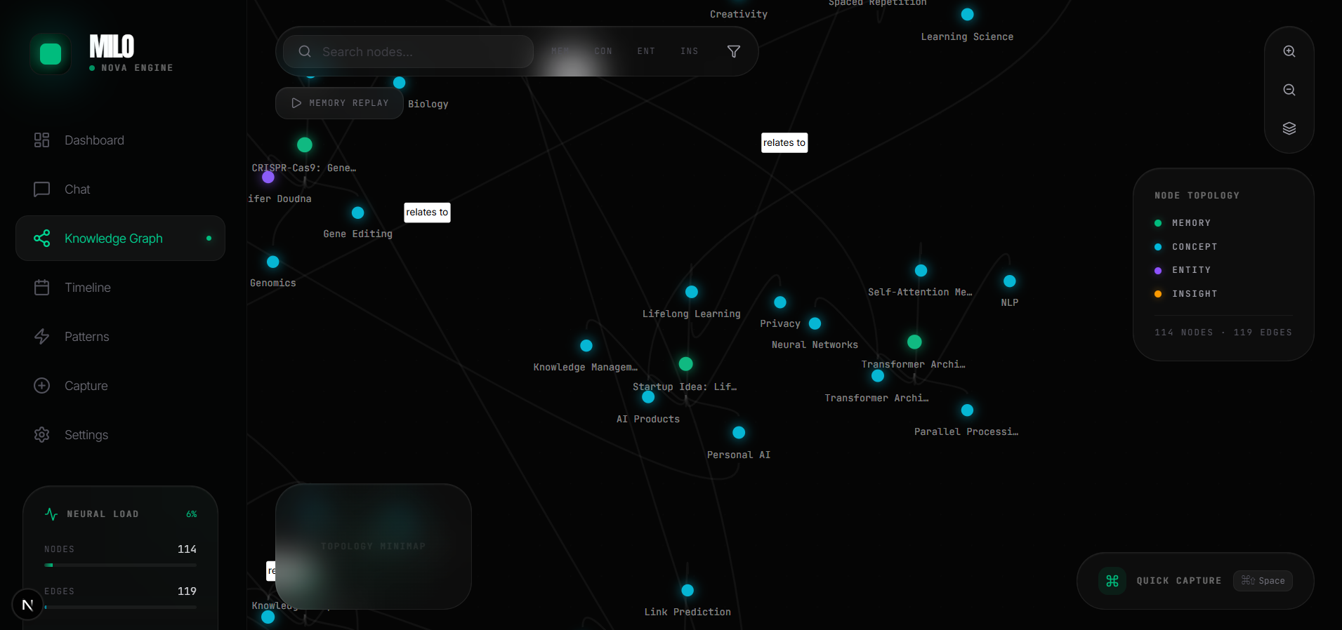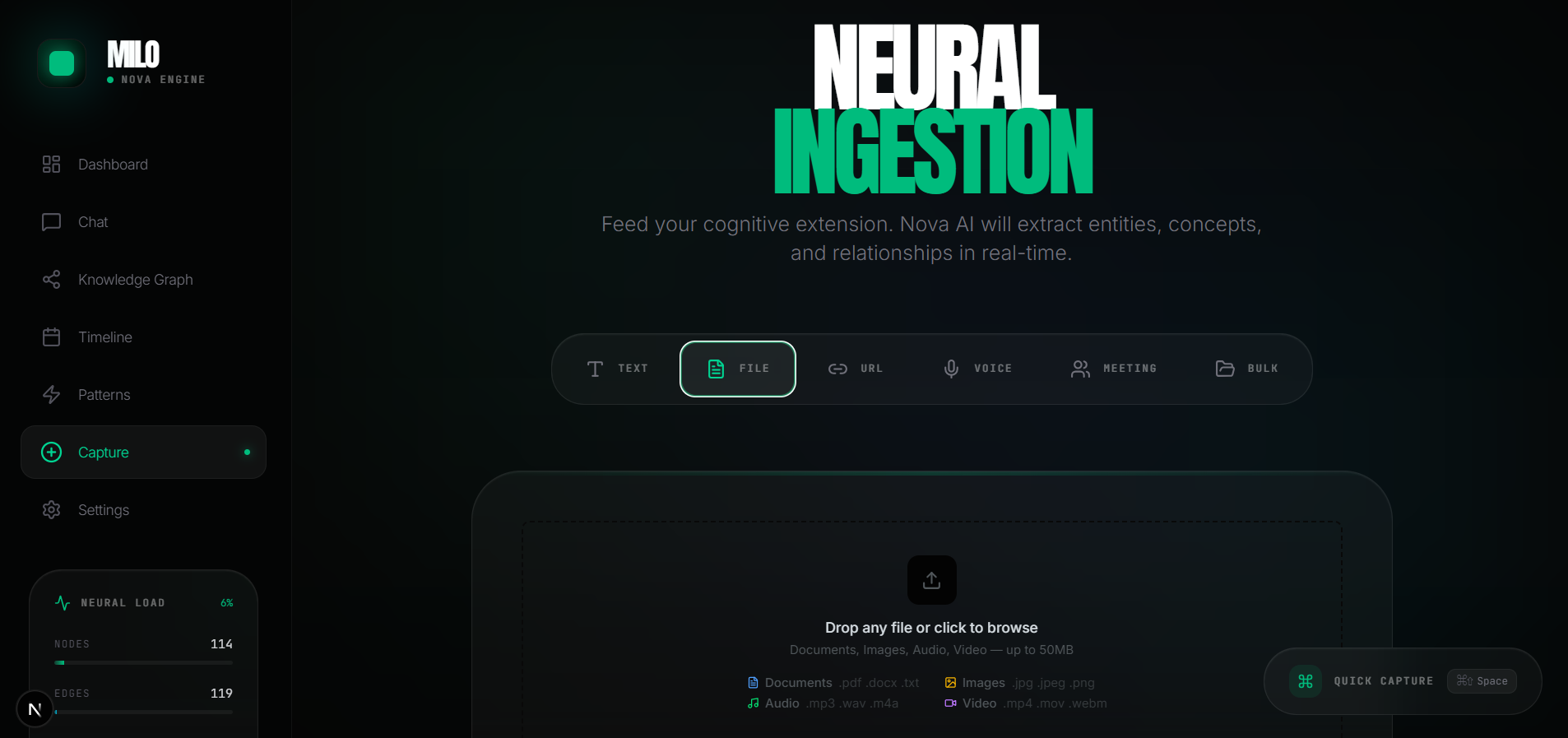 Milo is a personal AI memory system powered by Amazon Nova. It captures knowledge from multiple sources , typed notes, PDFs, documents, web articles, voice memos, and meeting transcripts , then structures everything into a living knowledge graph.