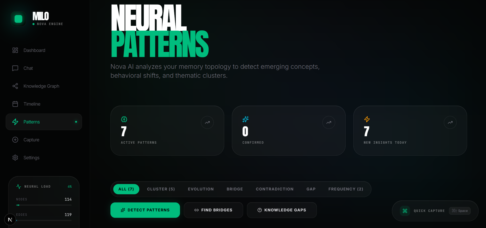 - Pattern detection that surfaces connections you didn’t notice: cross-domain concepts, evolving ideas, and contradictions in your thinking.