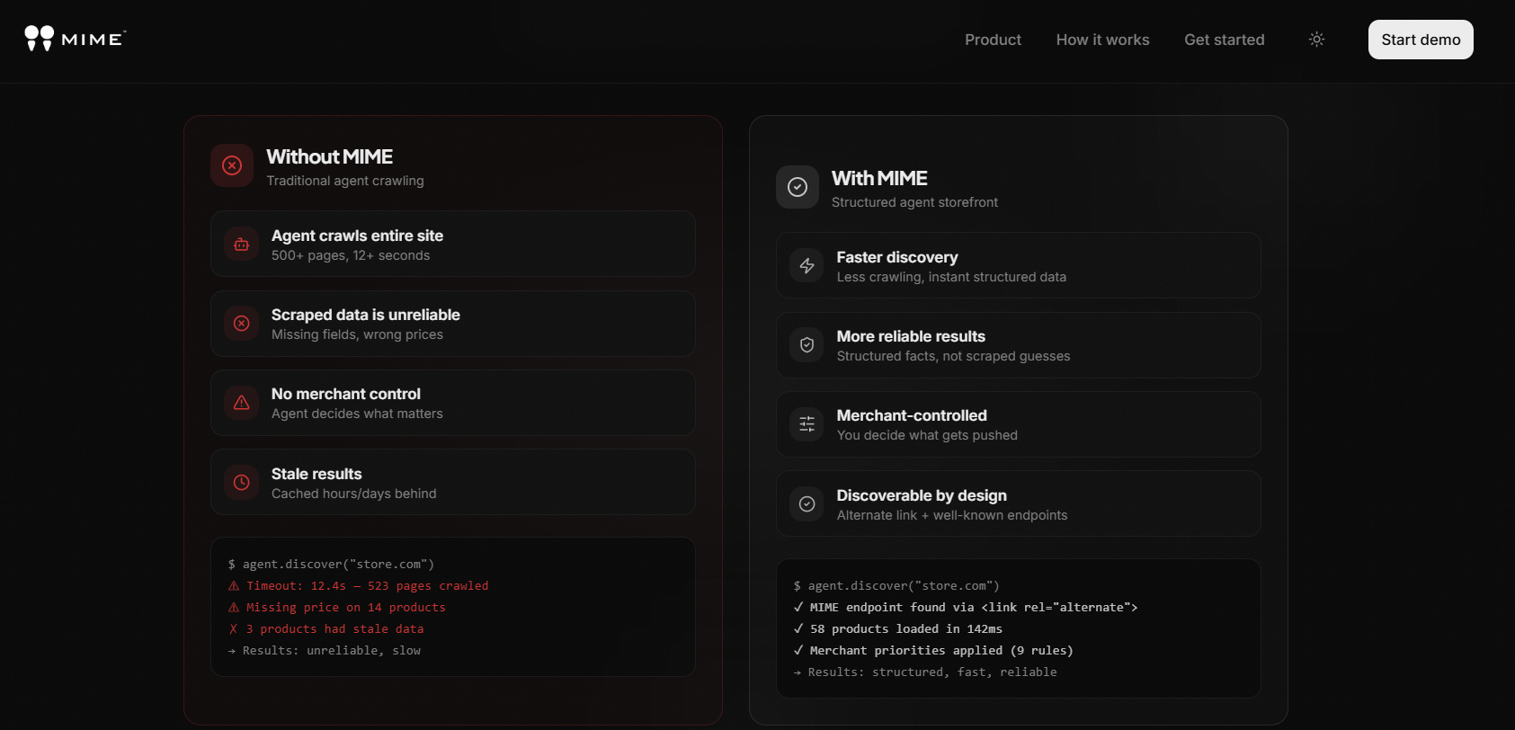 Our product crawls the store, enriches product data semantically, and generates dynamic JSON optimized for how people actually search (and subsequently, how their agents would behave). The AI Agent predicts likely query keywords and maps products accordingly, making retrieval faster and more accurate. The output is hosted by Mime and accessed via a simple snippet.