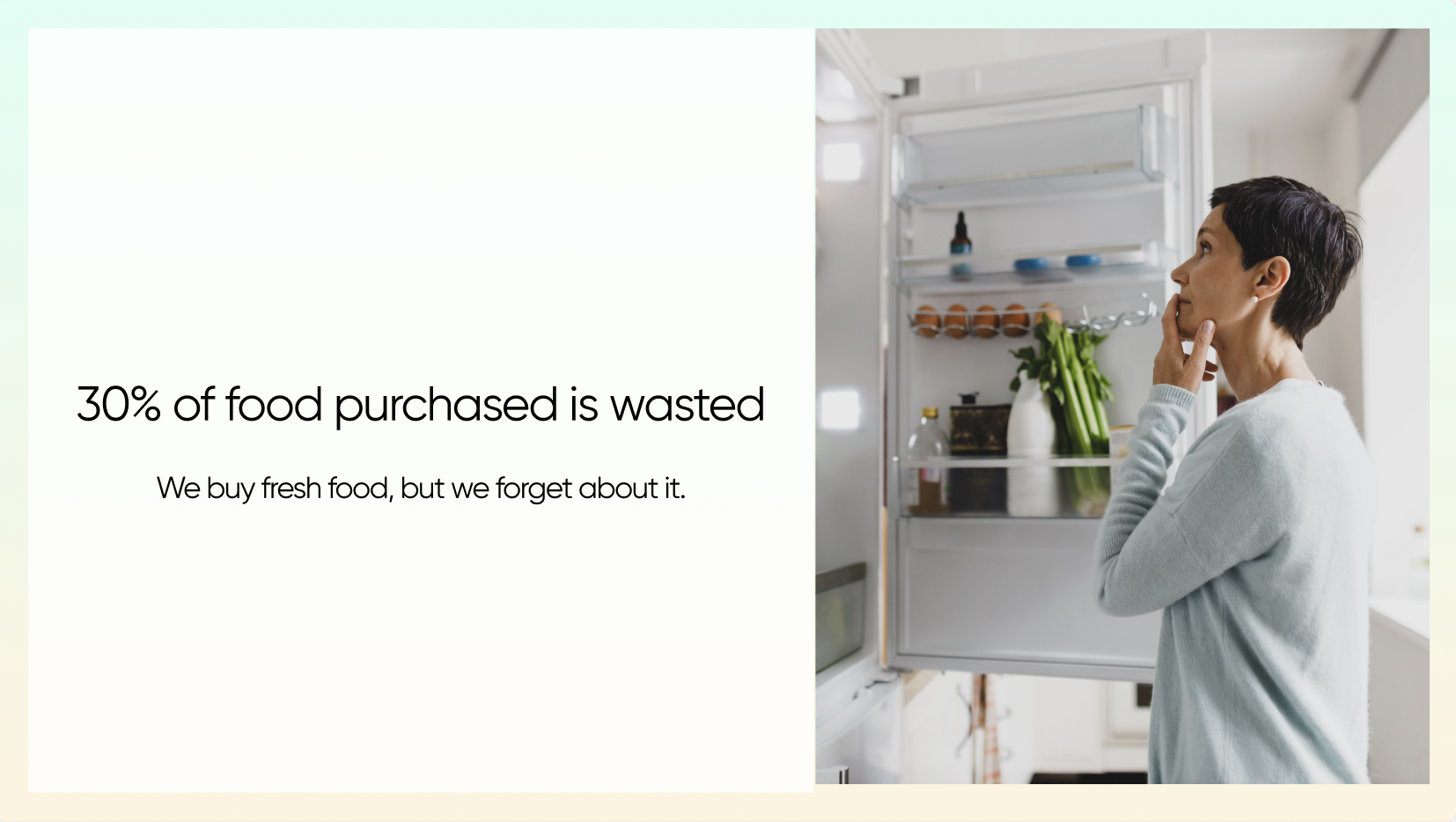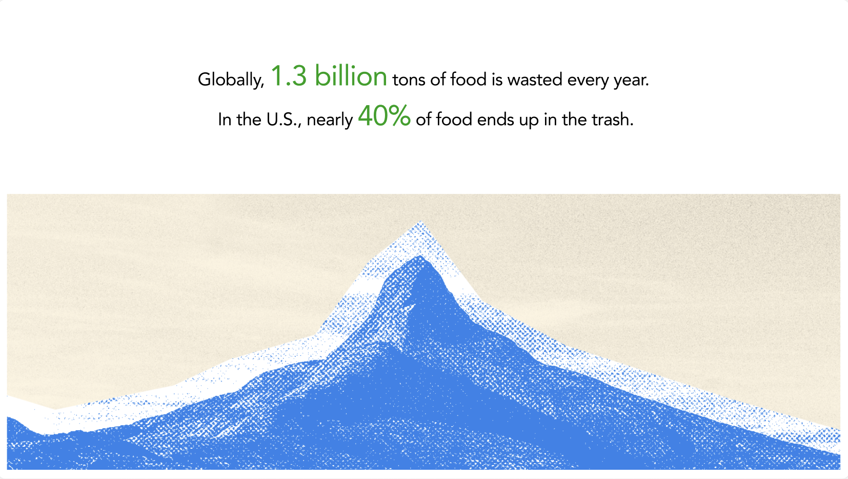 We are driven by the goal to end this cycle. 30-40% of the US food supply is food waste, much of which happens at the household level due to confusion over freshness and lack of immediate utility.