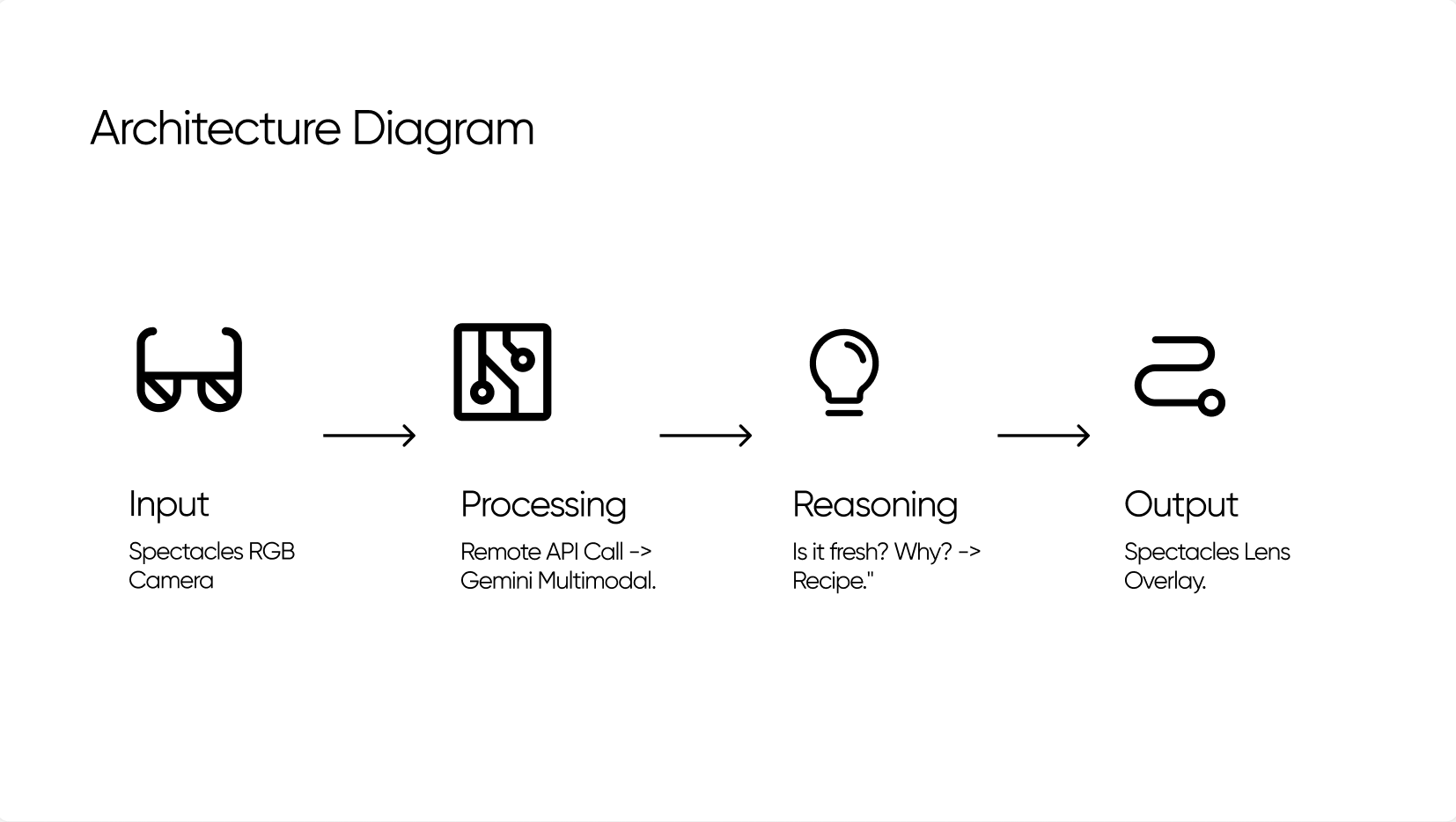 Our current proof of concept connects vision to intelligence for single items. Our future vision leverages the full power of the Spectacles: