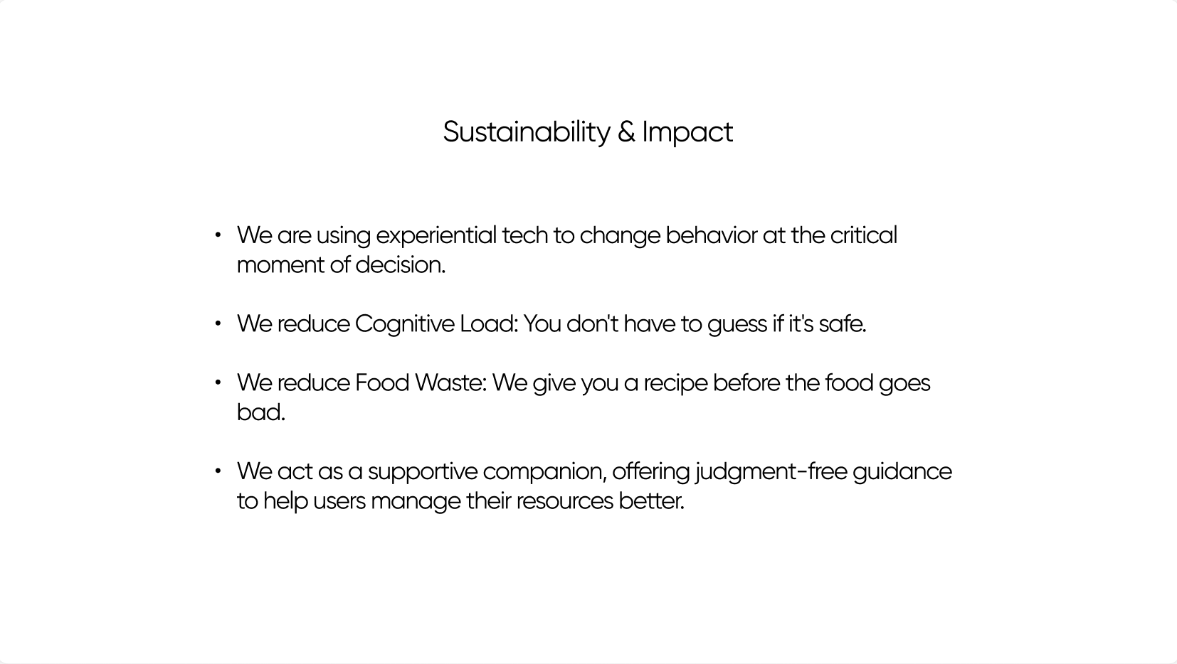 2. Feature expansion opportunities: Building the prototype expanded our thinking beyond freshness checks into multi-item reasoning, spatial persistence, and habit-forming interactions. These insights shaped a clearer roadmap for features that can drive adoption while advancing the goal of reducing household food waste.