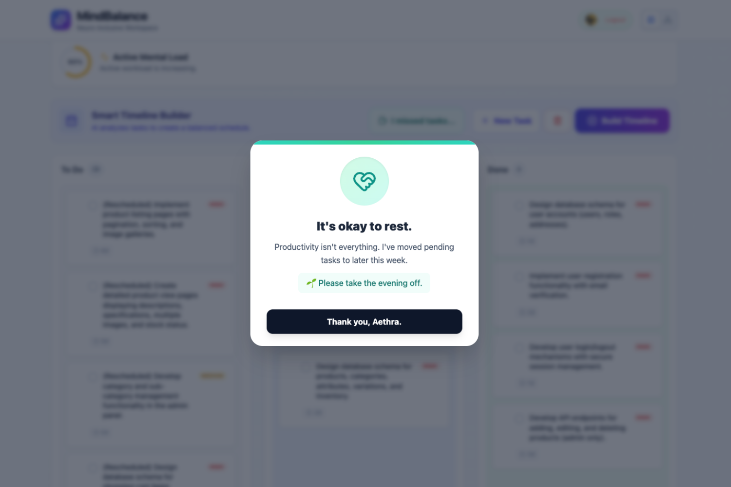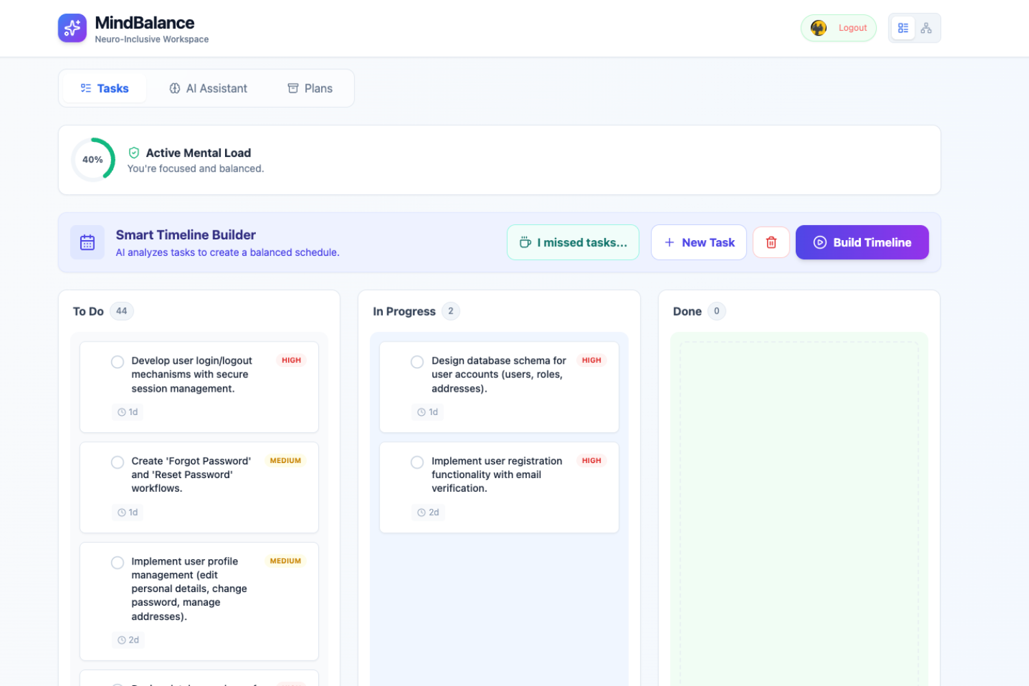 MindBalance was born from a simple yet profound realization: The world isn't designed for neurodivergent minds. For individuals with ADHD or Autism, traditional "To-Do lists" can be overwhelming, leading to "ADHD Paralysis" or burnout. We wanted to build more than just a task manager; we wanted to create a "Cognitive Shield"—a tool that understands that our mental energy isn't infinite.