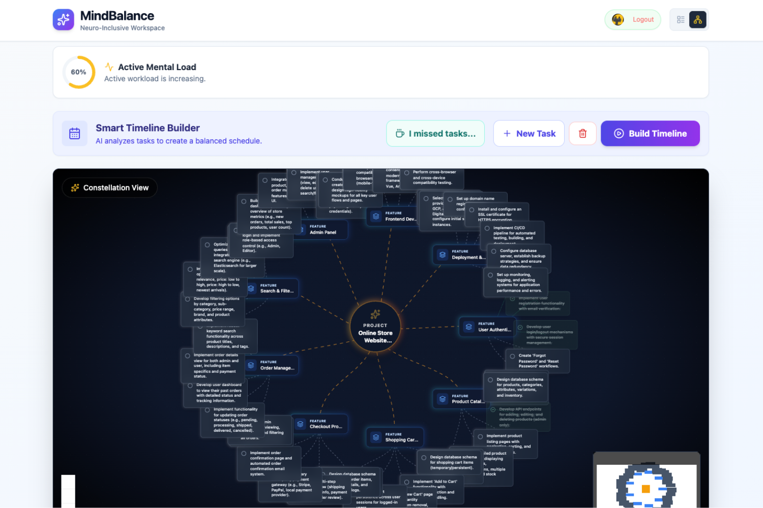Galaxy View (Spatial Mapping): Reimagines tasks as stars in a galaxy, helping users visualize the connections between tasks without the pressure of a rigid list.