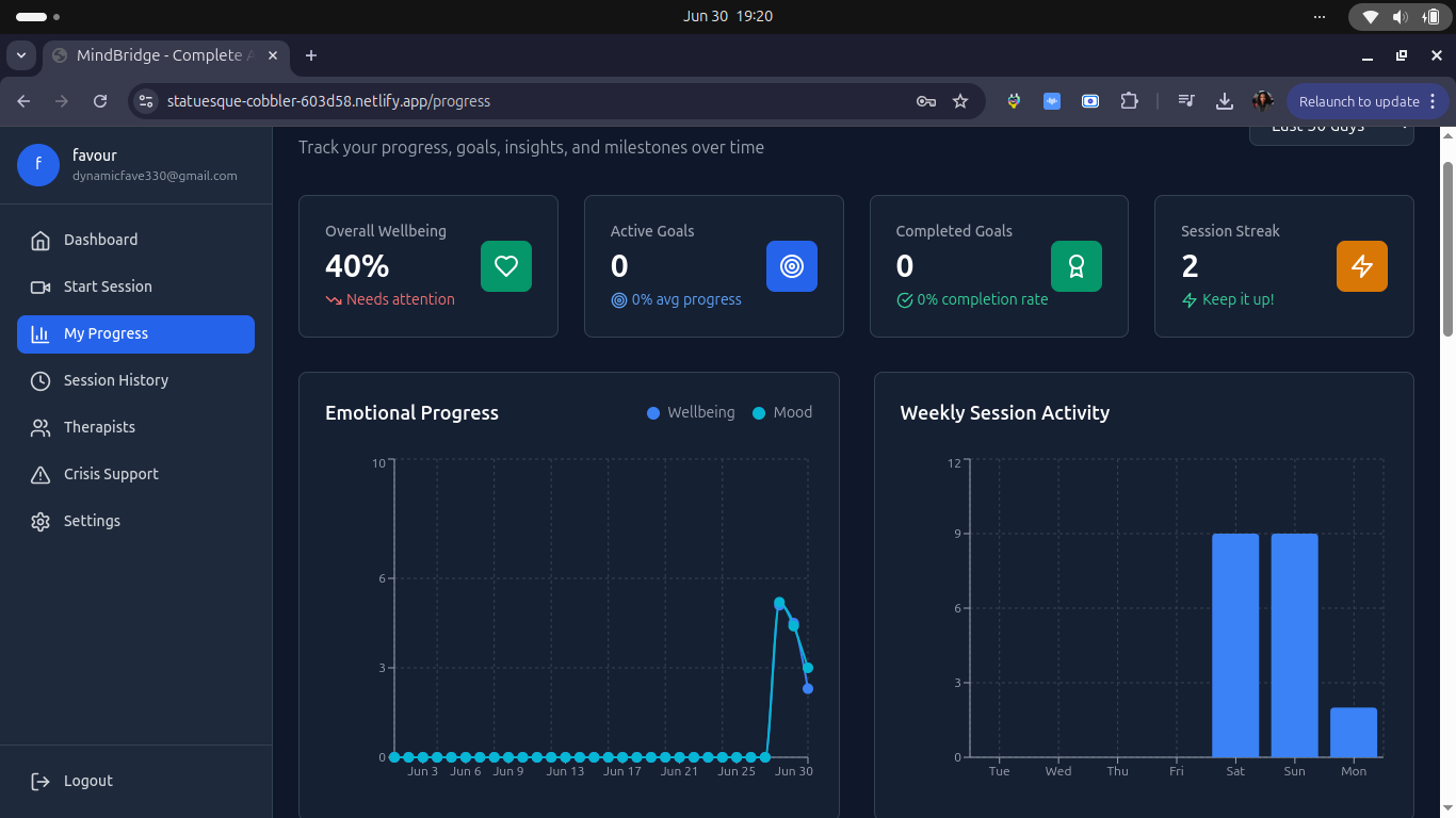 Revolutionary Technology Stack: Successfully integrated cutting-edge conversational AI video with mental health therapy - something that didn't exist before. Single-Prompt Success: Built the entire platform foundation using only one Bolt.new prompt, demonstrating the power of AI-assisted development. Complete Healthcare Solution: Created not just a chatbot, but a comprehensive therapy platform with crisis intervention, progress tracking, and professional-grade features. Real-World Impact Potential: Addressed a $240 billion mental health market with a solution that could democratize therapy access globally. Technical Innovation: Pioneered the use of visual emotional intelligence in therapy applications.