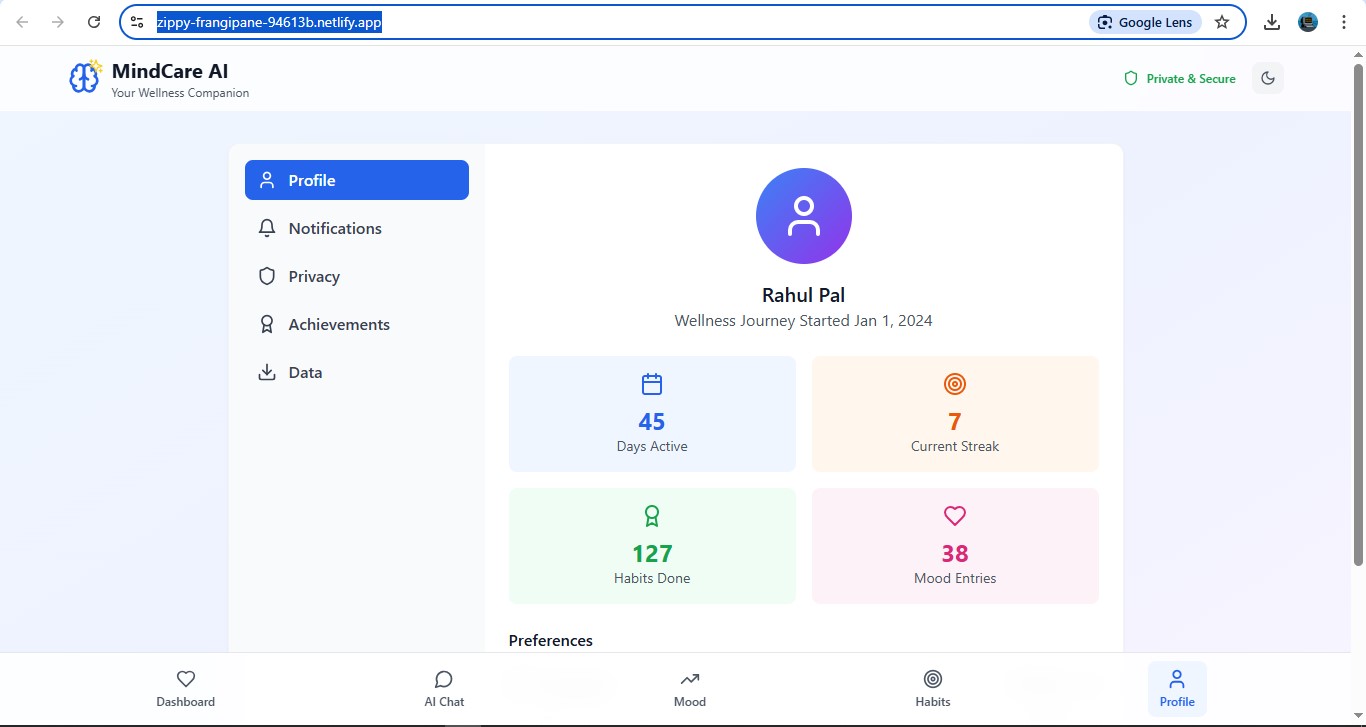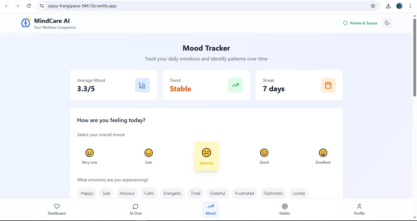 MindCare AI is an AI-powered mental wellness companion that offers intelligent chat support, comprehensive mood tracking, and gamified habit formation. It enables users to log emotions, receive personalized coping strategies, track their wellness trends, and stay motivated through achievement-based progress—all while ensuring privacy and ease of use.