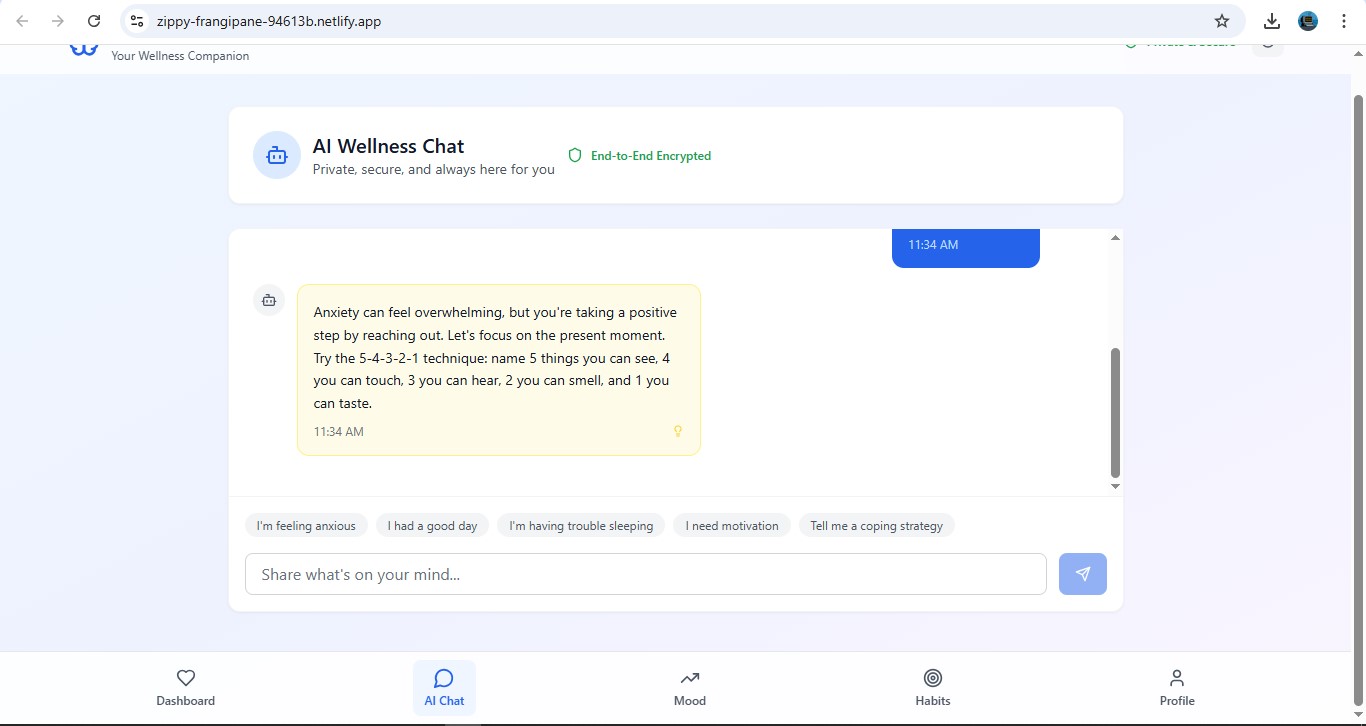 The rising global mental health crisis, exacerbated by limited access to affordable, stigma-free, and continuous care, inspired us to build a digital solution that is always available, private, and user-centric. Many individuals struggle with managing their mental wellness due to lack of resources, time, or awareness. We wanted to create a platform that empowers users to take charge of their mental well-being through empathetic AI support and daily self-care tools.