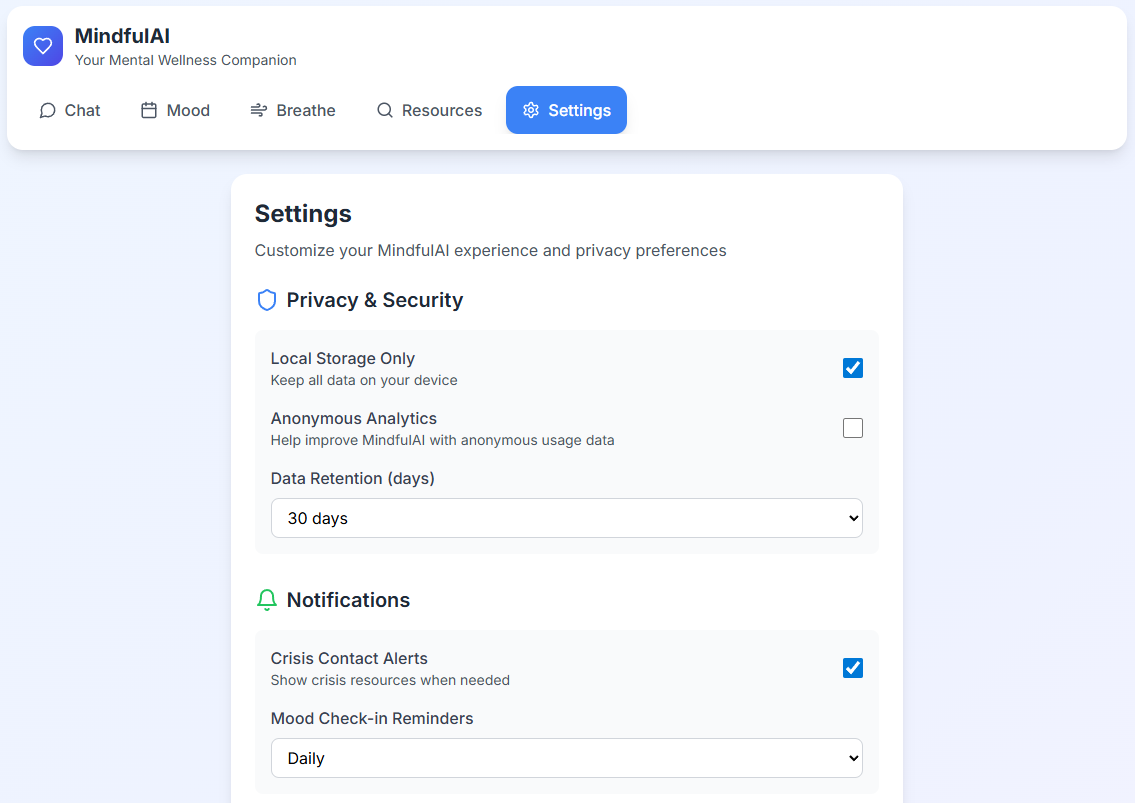 Mental health is deeply personal. That’s why MindfullAI is built with privacy-first settings and local encryption. Your data stays with you—always.