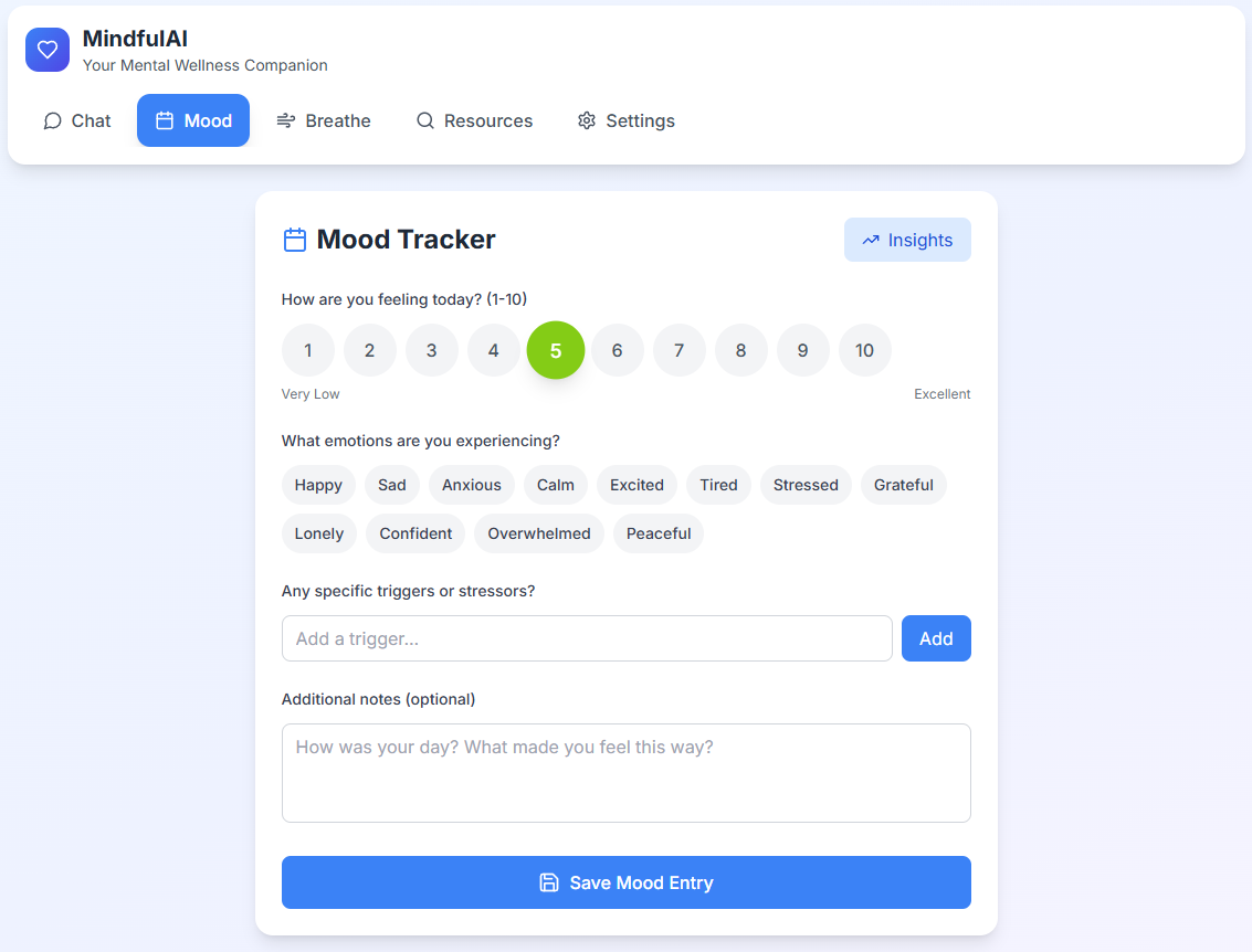 Healing begins with awareness. MindfullAI’s Mood Tracking feature transforms daily check-ins into meaningful insights. Through elegant analytics and visual trends, users can understand their emotional rhythms and take control of their mental well-being.