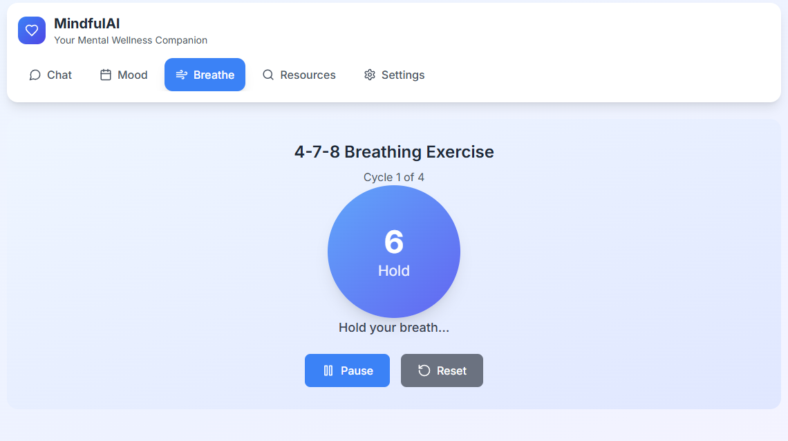 To help users manage stress in real time, we integrated guided breathing exercises using the 4-7-8 technique. With calming animations and gentle cues, MindfullAI becomes a pocket-sized mindfulness coach—helping users find calm in the chaos.