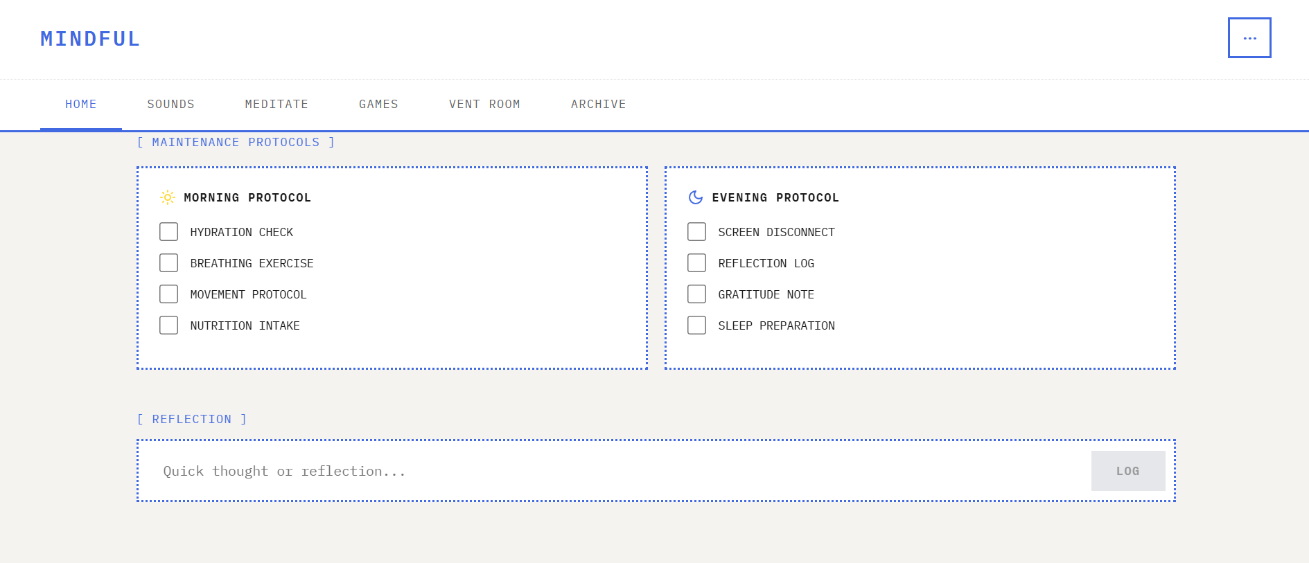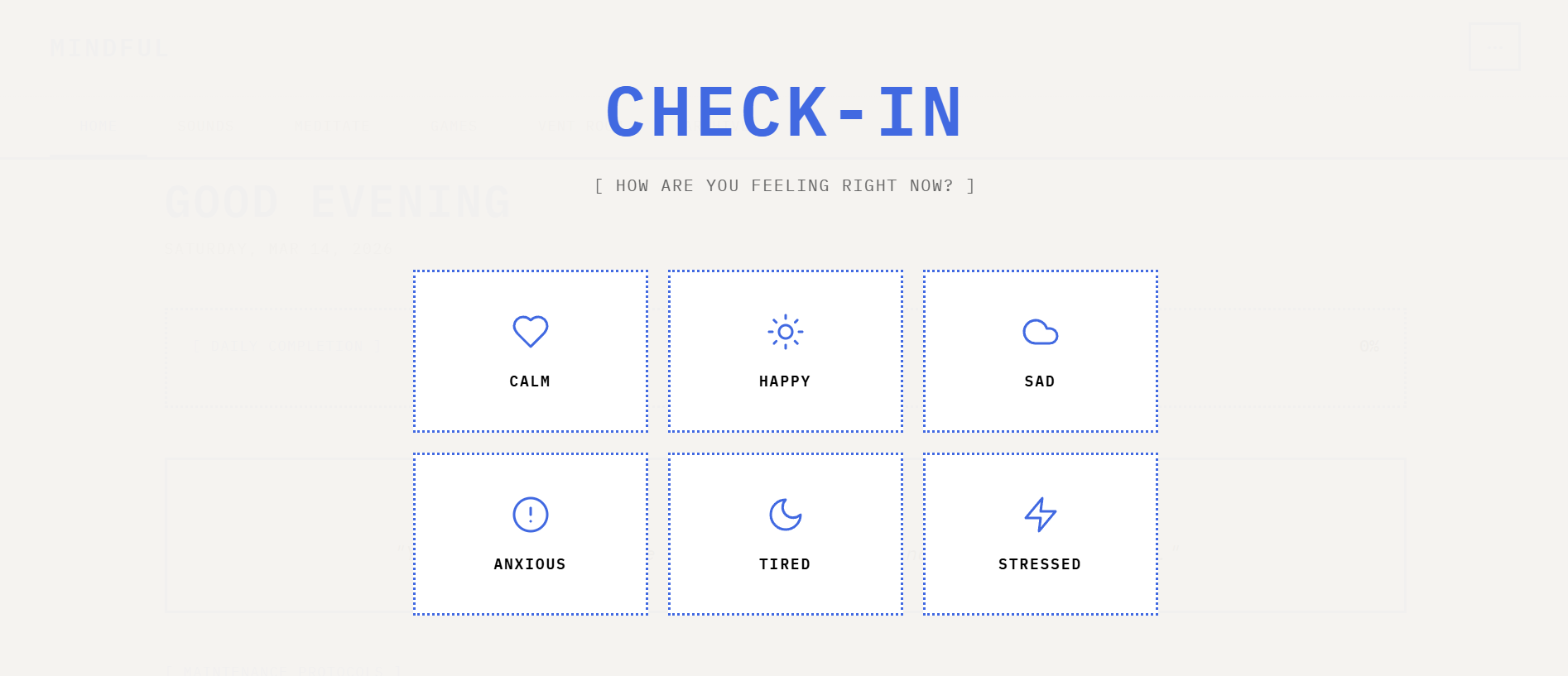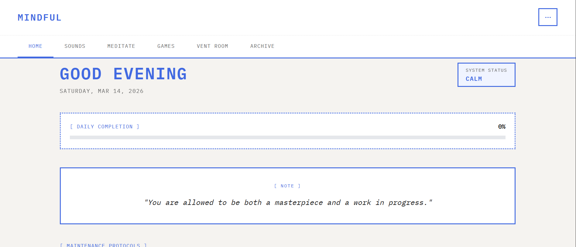 Navigating the final years of an engineering degree comes with intense academic pressure, and it’s incredibly easy for students to experience burnout, stress, and fatigue. I wanted to build a tool that didn't add to that cognitive load. Most health apps are cluttered, noisy, and overwhelming, which is the last thing a stressed student needs. The inspiration for Mindful was to create a digital sanctuary: a student mental health tracker with a highly minimalist, Notion-like aesthetic that actually helps reduce anxiety just by using it.
